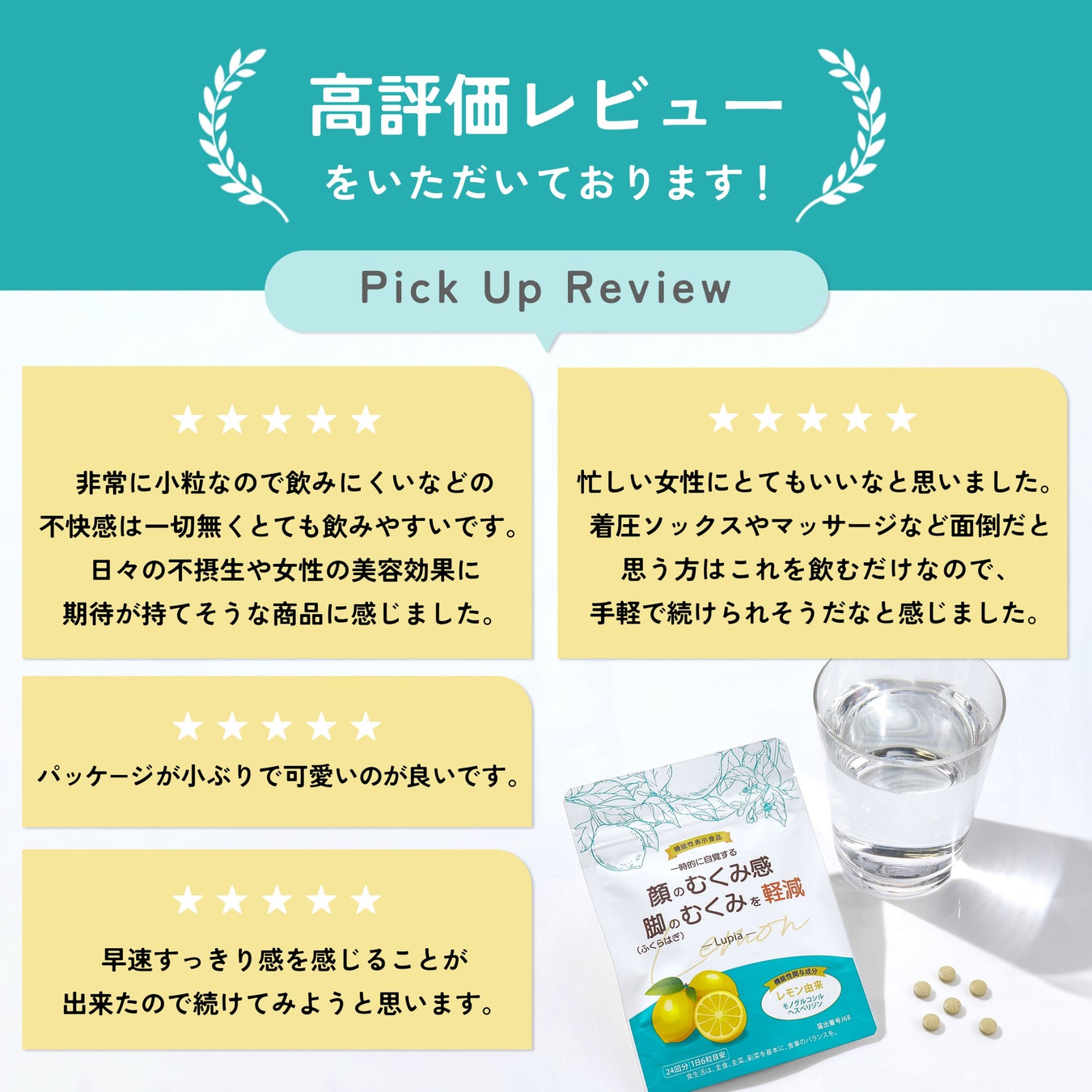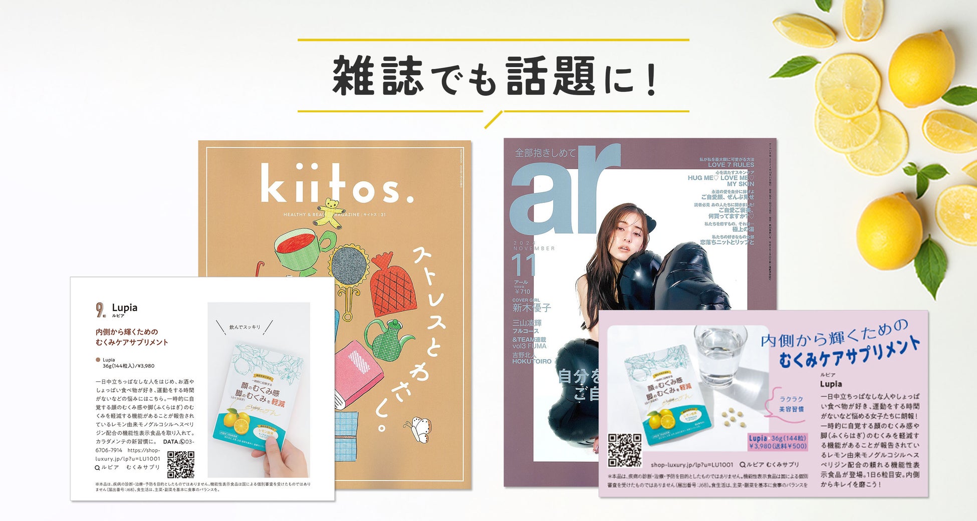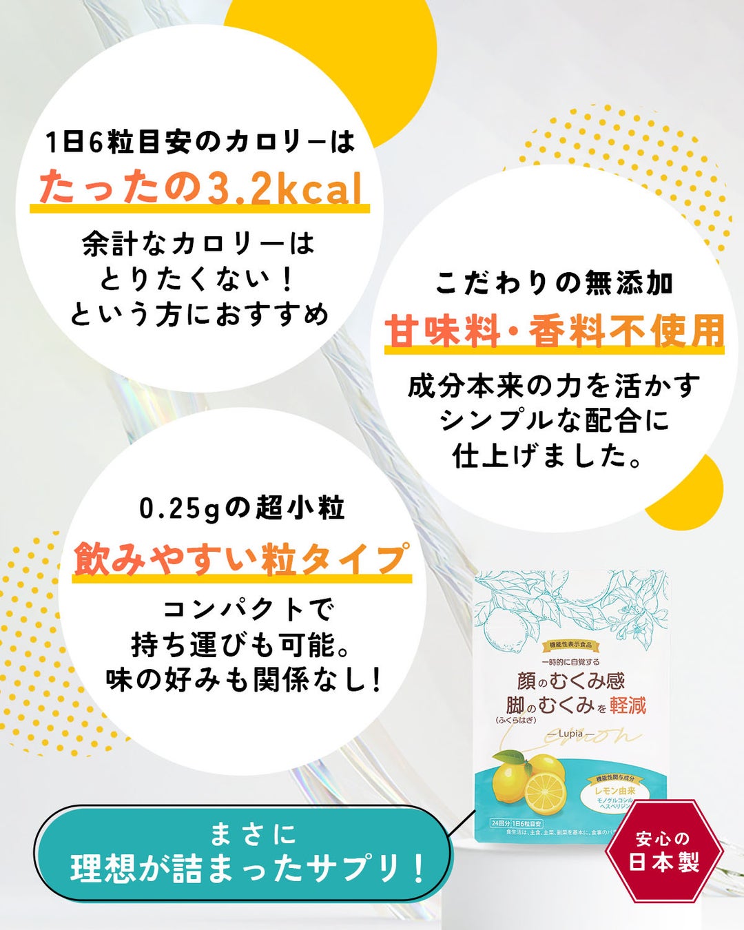 「Lupia」は、忙しい生活の中でも内側からの美しさを引き出し、毎日をすっきりと過ごしていただくためのサプリメントです。手軽に続けられる本製品で、是非むくみ知らずな日々を手に入れてください。