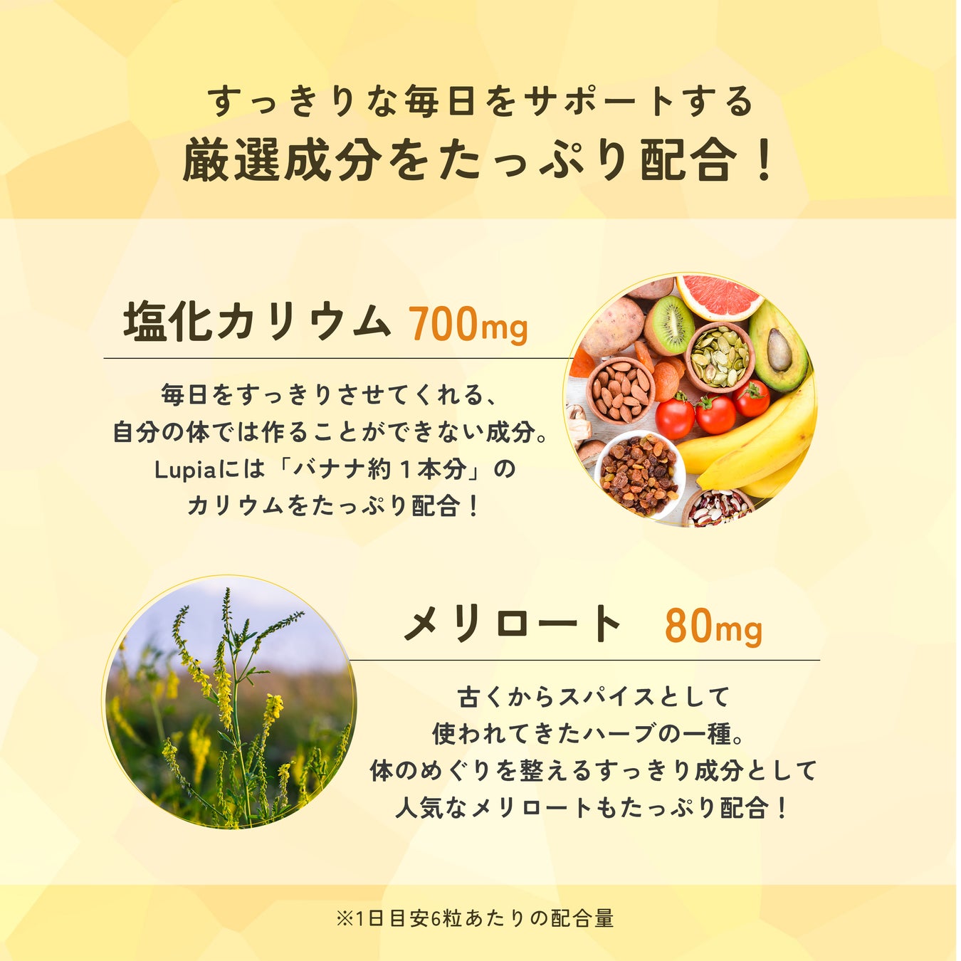 「レモン由来モノグルコシルヘスペリジン(300mg)」に加えて、すっきりな毎日をサポートする「塩化カリウム(700mg)」と「メリロート(80mg)」を贅沢に配合。