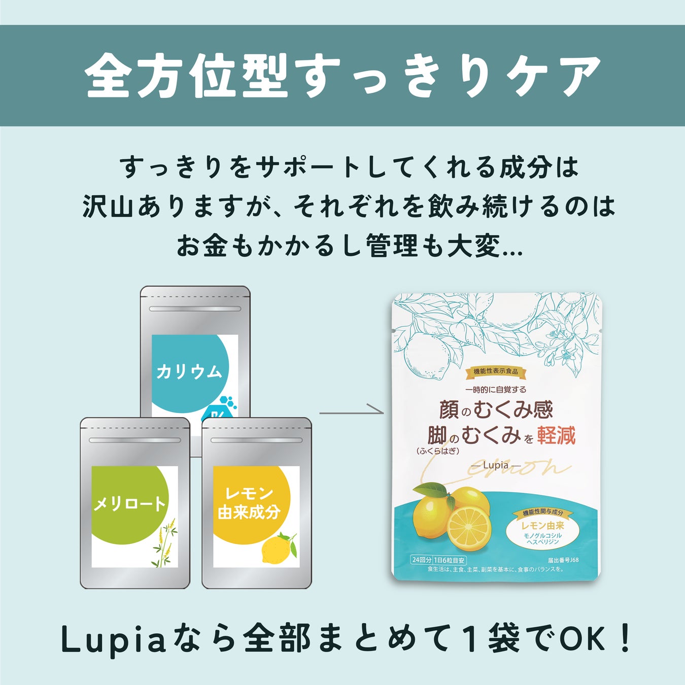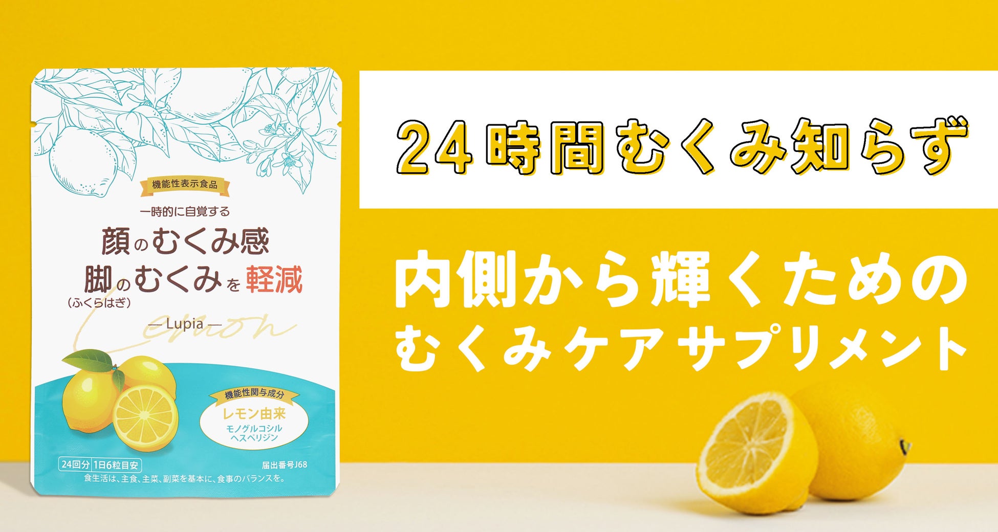 本製品は、機能性関与成分「レモン由来モノグルコシルヘスペリジン」を含有しており、一時的に自覚する顔のむくみ感や、脚(ふくらはぎ)のむくみを軽減する効果が期待できるサプリメントです。機能性表示食品として、消費者庁に届出されており、科学的根拠に基づく安全性と機能性が確認されています。(届出番号J68)