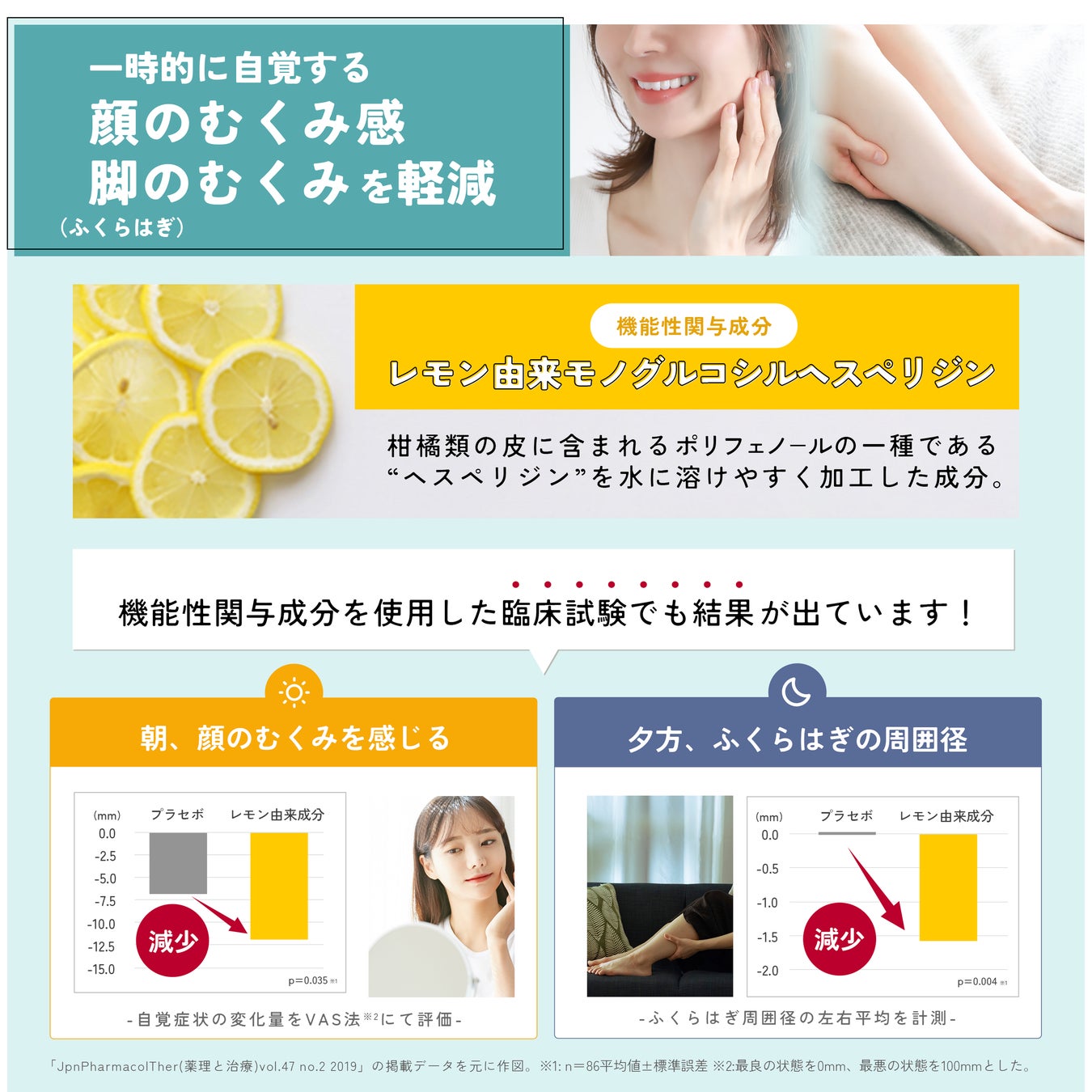 本品にはレモン由来モノグルコシルヘスペリジンが含まれます。レモン由来モノグルコシルヘスペリジンには、一時的に自覚する顔のむくみ感や、脚(ふくらはぎ)のむくみを軽減する機能があることが報告されています。