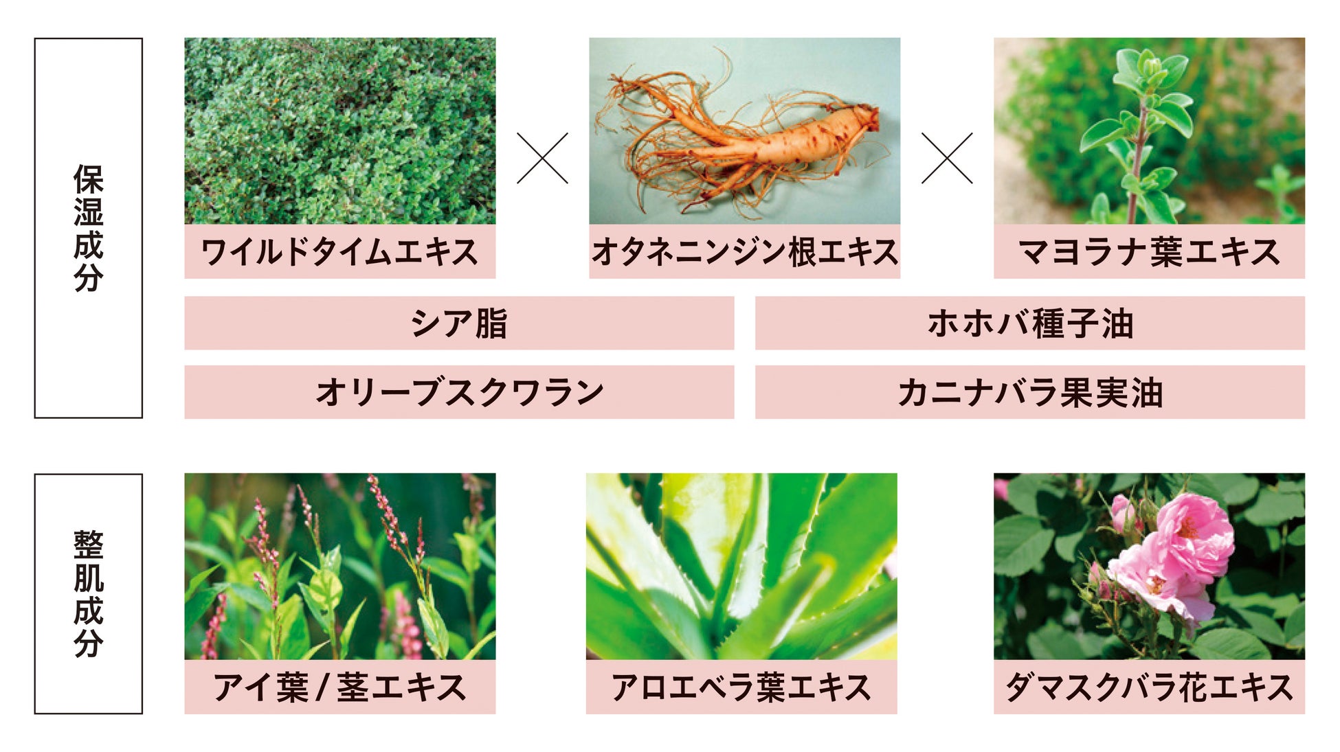 6種の植物エキスと4種の植物性オイルを配合。ワイルドタイムエキス×オタネニンジン根エキス×マヨラナ葉エキスが複合的に作用し、しっとりなめらかな肌に整え、乾燥から守ります。