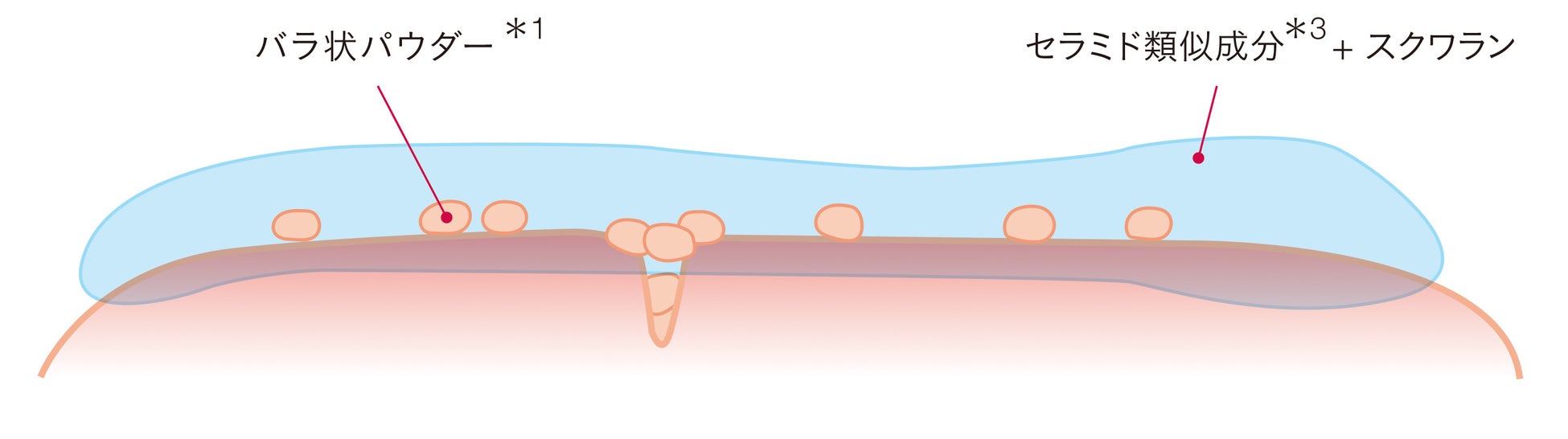 *1 炭酸Ca<メイクアップ成分> *2 メイクアップ効果 *3 そのうちセラミド類似成分とスクワランを合計40%配合 *4 ラウロイルグルタミン酸ジ(フィトステリル/オクチルドデシル)、ラウロイルグルタミン酸ジ(オクチルドデシル/フィトステリル/ベヘニル)<保湿成分> *5 保湿成分 *6 約40%