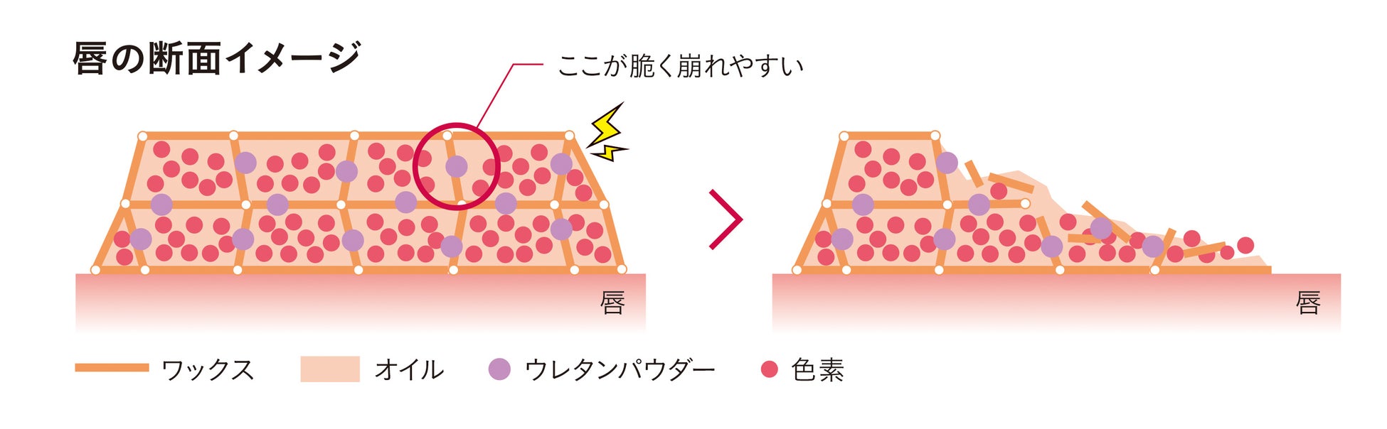 カードハウス構造のワックスを使用しているため、小さな圧力でも崩れやすく軽いタッチで伸び広がります。また、カードハウス構造の隙間にはソフトで弾力性のあるウレタンパウダー*2が含まれているため、崩れたあともなめらかに塗り広がります。