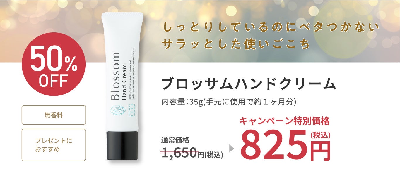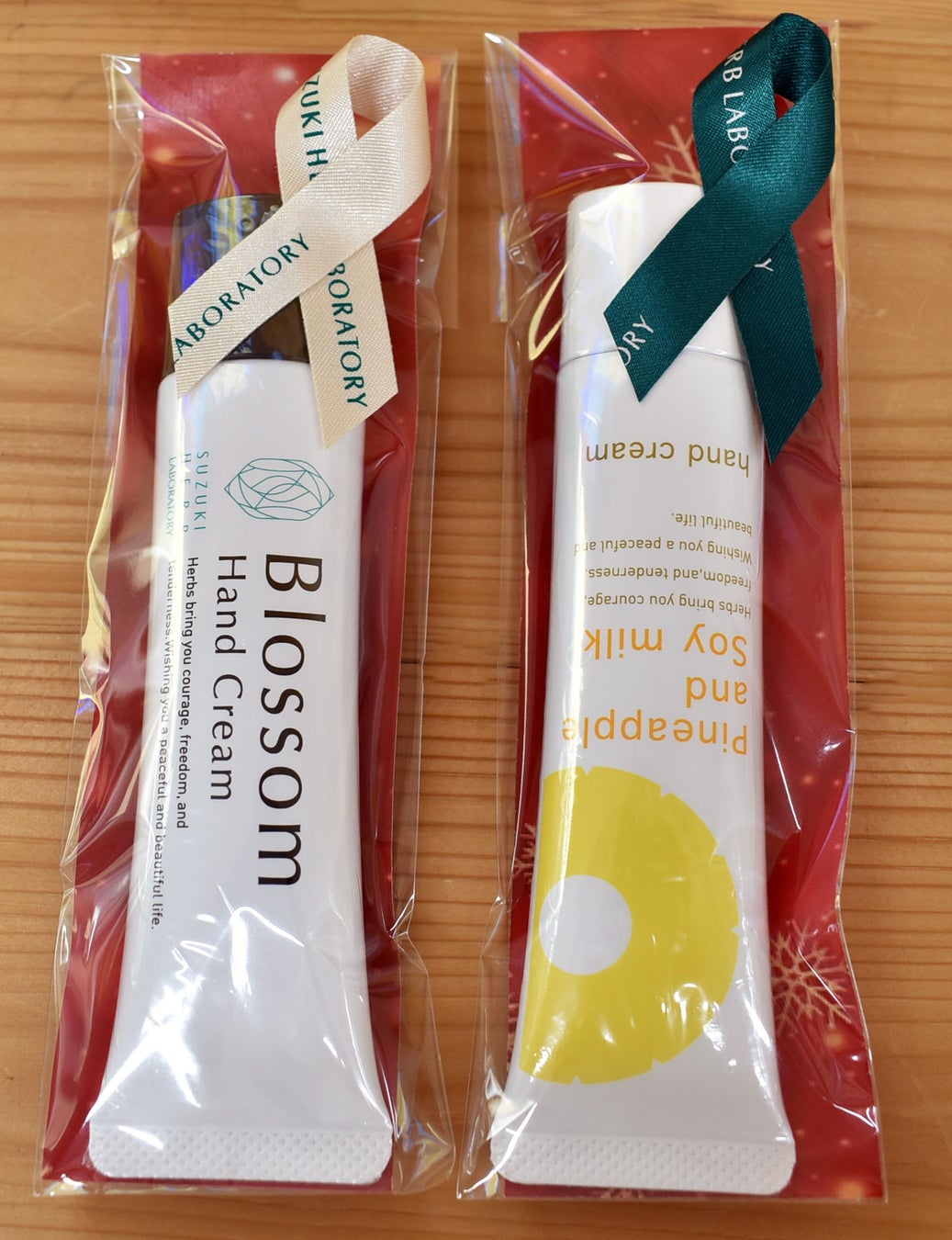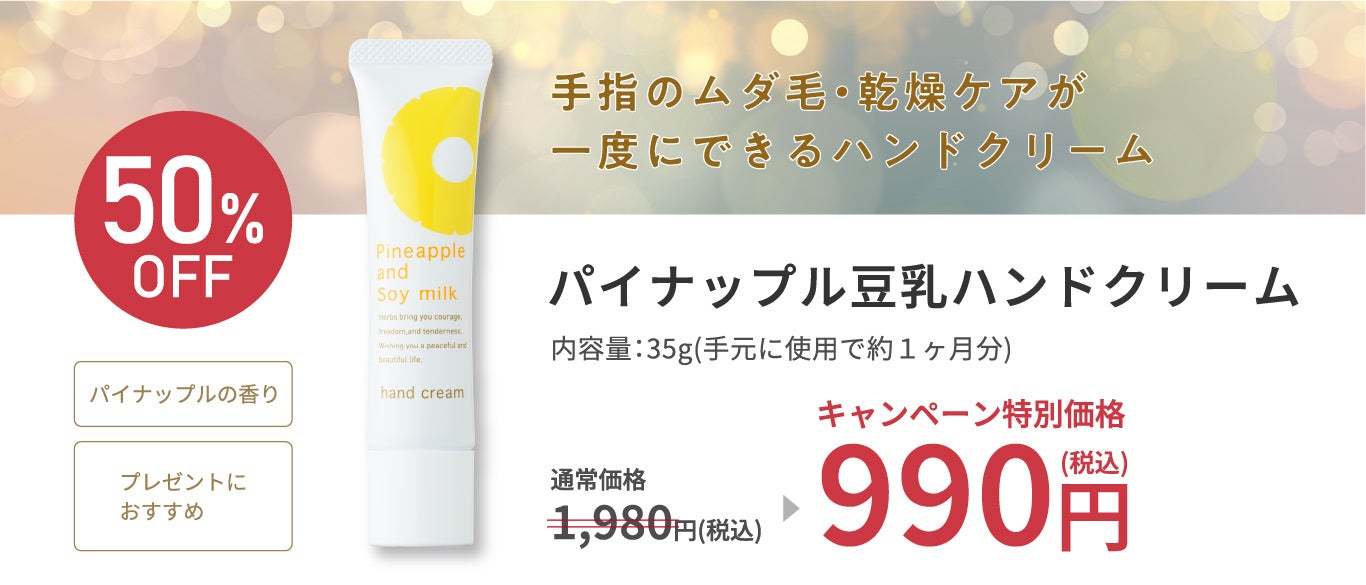 株式会社鈴木ハーブ研究所は2024年11月27日(水)~12月25日(水)の期間、冬の必需品であるハンドクリームがお得に購入できる「手肌いたわりキャンペーン」を開催いたします。体毛ケア*1成分配合の<パイナップル豆乳ハンドクリーム>、無香料で使いやすい<ブロッサムハンドクリーム>が弊社WEBサイトまたはお電話のお申込み限定で、通常価格の50%オフでご購入いただけます。クリスマスプレゼントにも最適な無料のギフトラッピングもご用意しています。