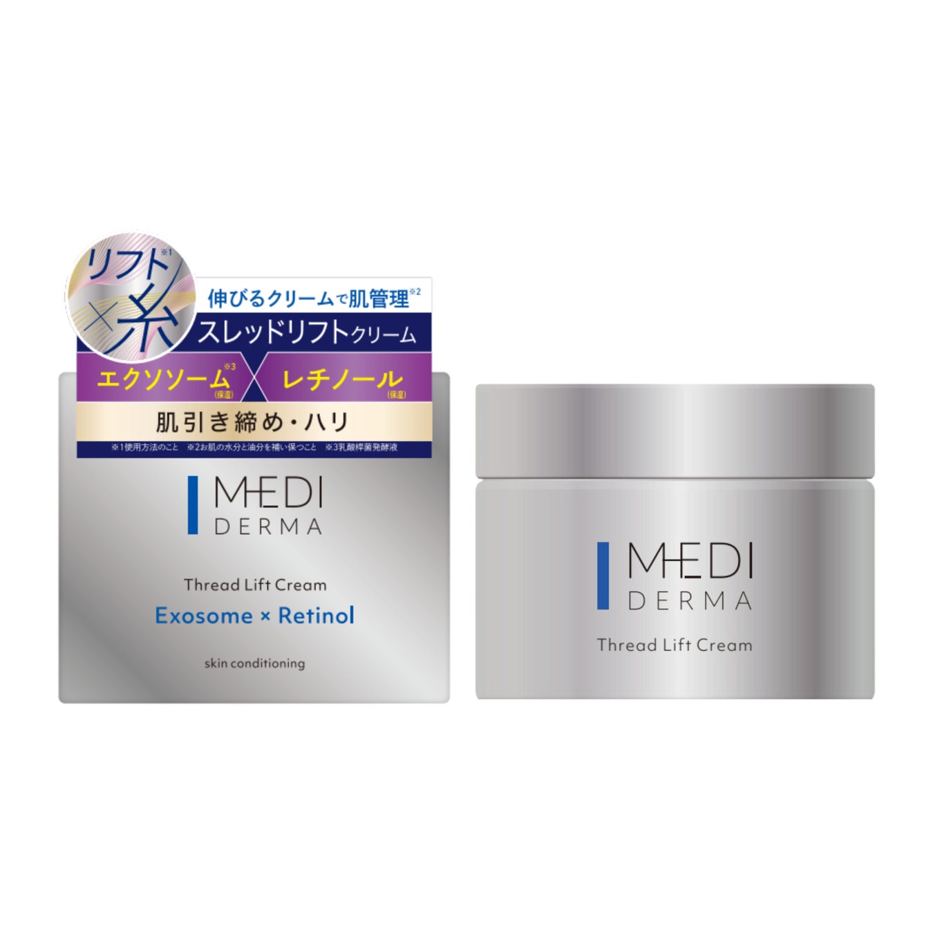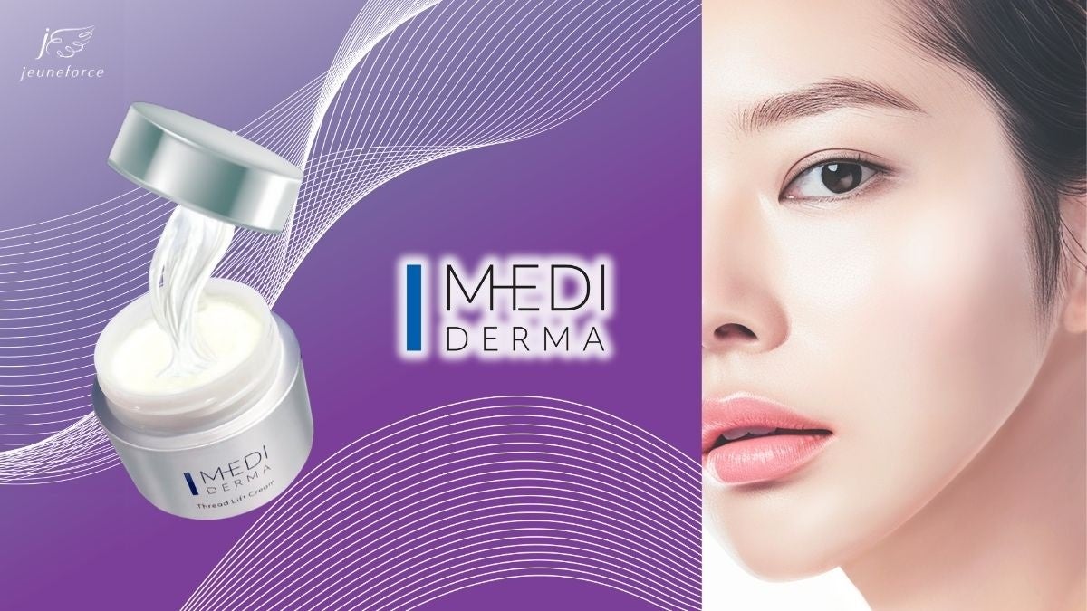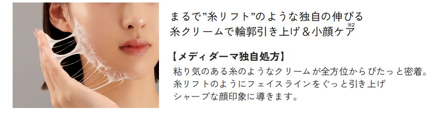 「メディダーマ」は美容医療発想のスキンケアシリーズとして2024年秋にデビューいたしました。その 第二弾として糸で引き上げる※1小顔メンテクリーム※2「メディダーマ スレッドリフトクリーム」を発売いた します。昨今美容医療に対する興味関心が高まっており、肌のたるみを改善しフェイスラインをシャープ に持ち上げる「糸リフト」の施術が人気を博しており、自宅でも手軽に輪郭ケアをかなえたいというニー ズも高まっています。独自処方の伸びるクリームが、まるで糸のように絡み合いスレッドヴェールを形 成。ぴったりと密着しフェイスラインを整えます。さらに乳酸桿菌由来「エクソソーム※3」や「レチノー ル」も配合されシャープに引き締まった弾力のある肌へ導きます。