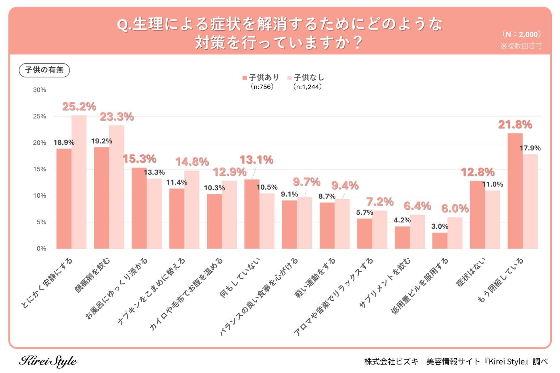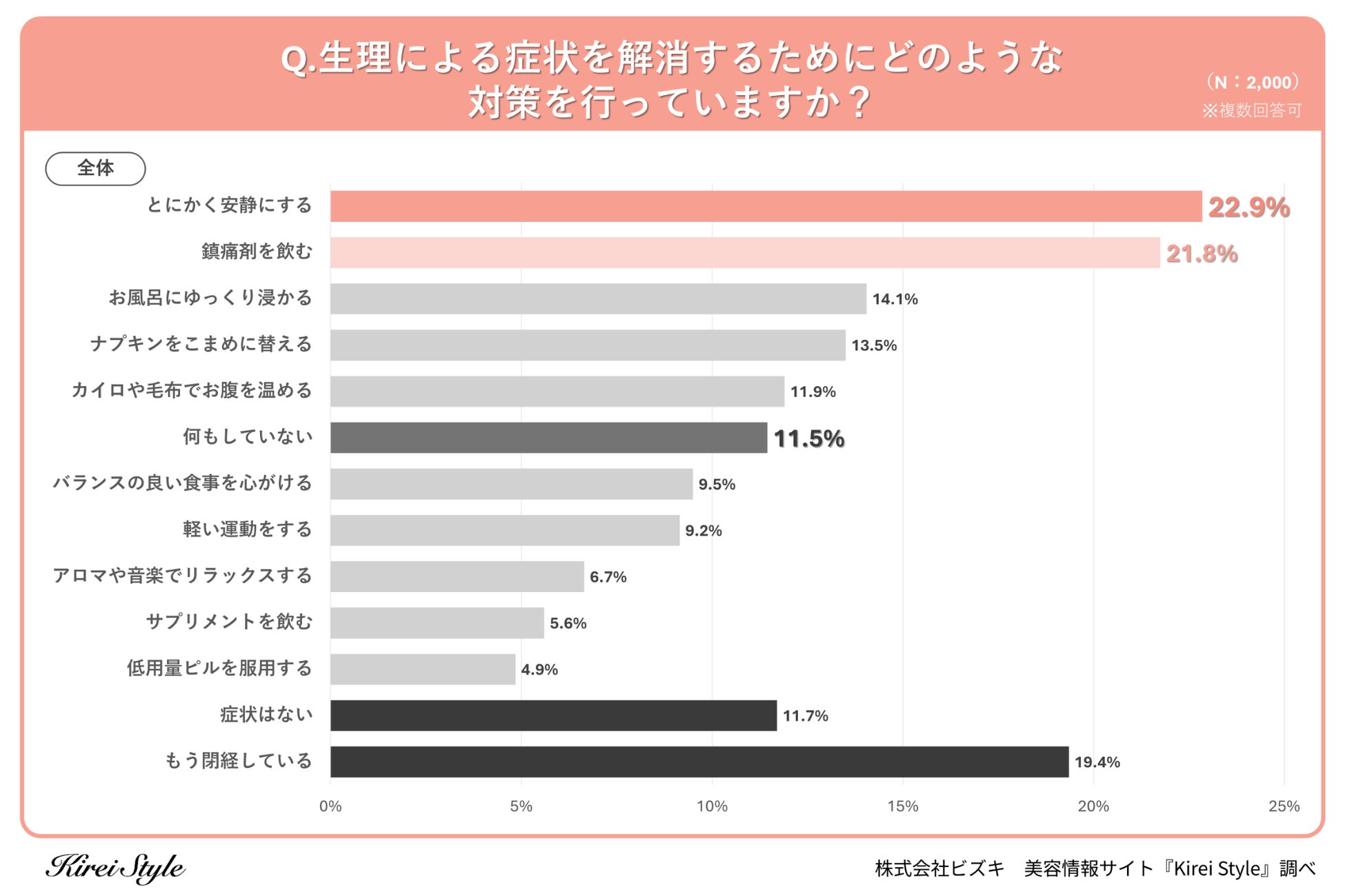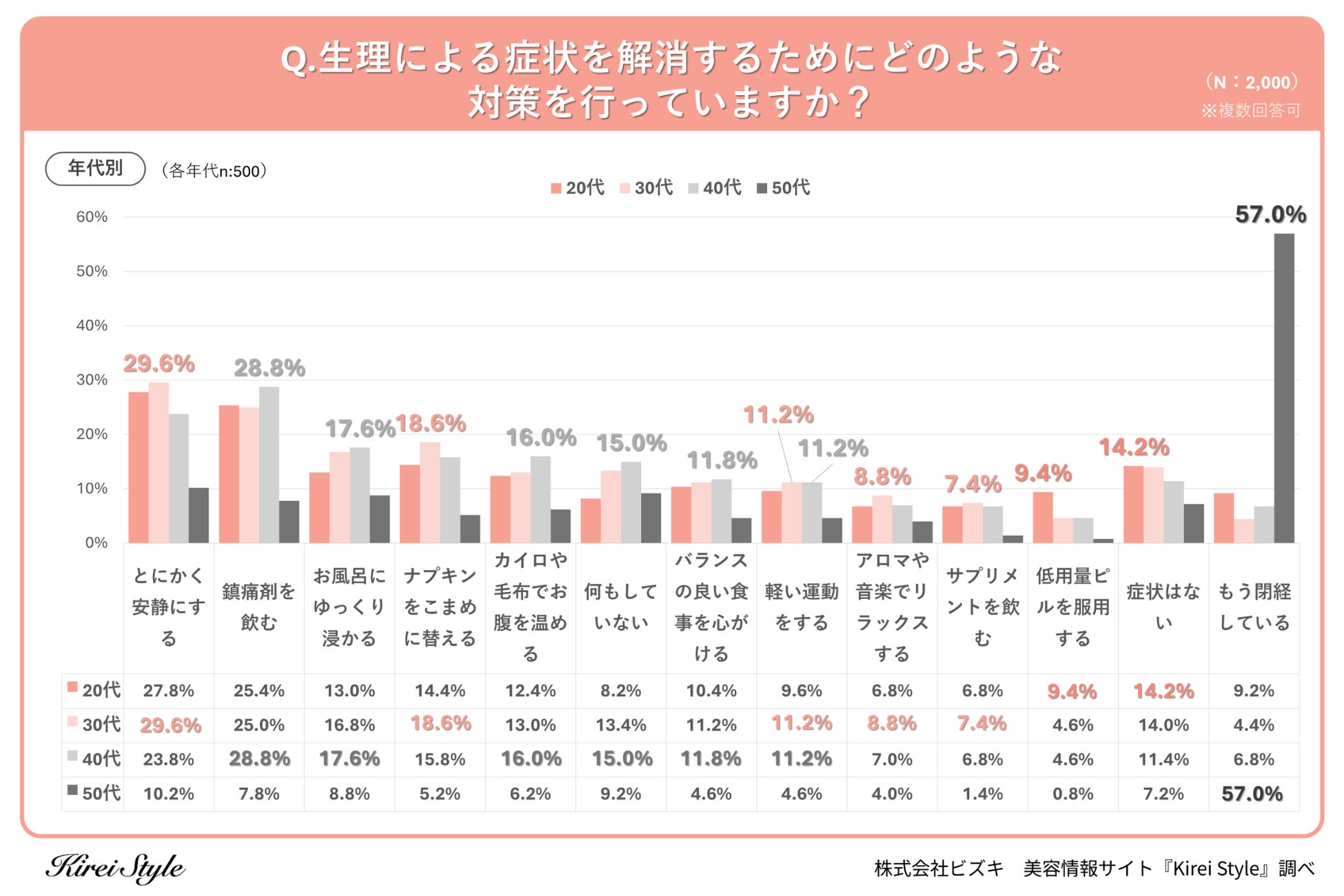 「今のキレイも、10年後の輝きも」をコンセプトに美容や健康にまつわる情報を発信する「Kirei Style(キレイスタイル)」の運用を行う株式会社ビズキは、全国の女性2,000人を対象に生理に関するアンケートを実施し、年代別等の特徴についてまとめました。