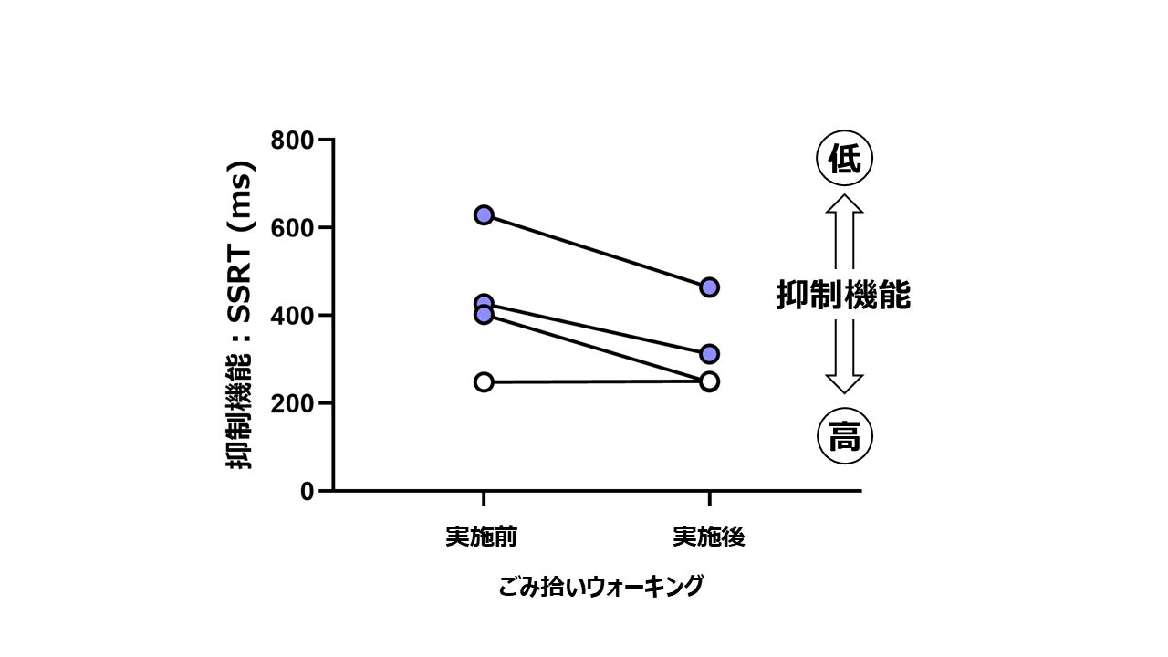 ①認知抑制機能:ごみ拾いウォーキング後に、4名の参加者のうち3名の方で、抑制機能の向上が確認されました。