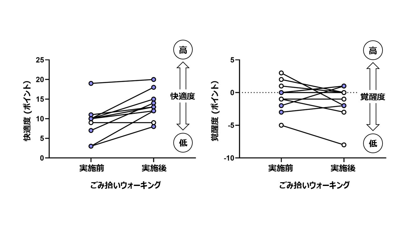 ②気分の変化:ごみ拾いウォーキング後に、10名の参加者のうち9名の方で、快適度の向上が確認されました。