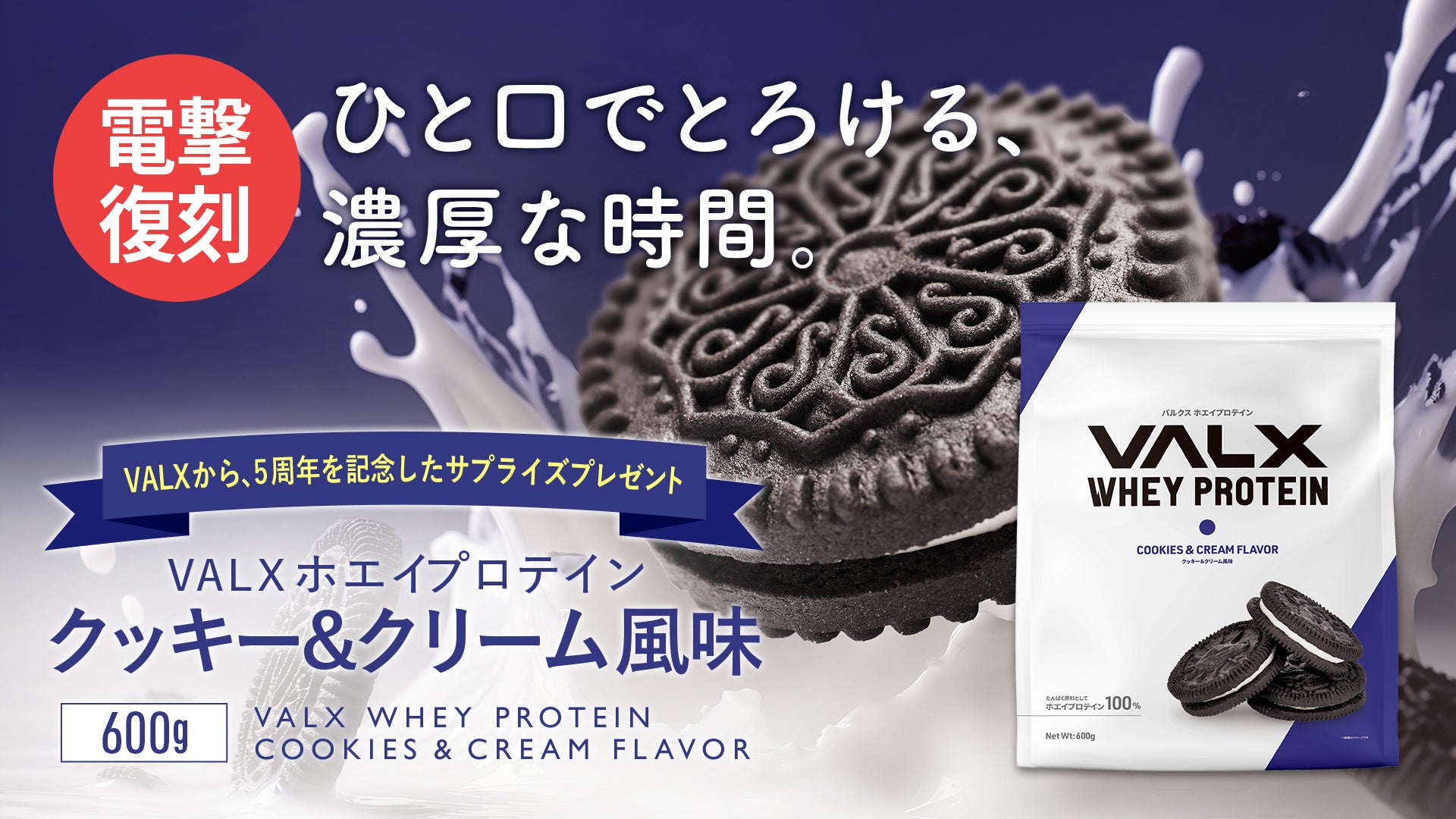 今回は5周年を記念して、VALXからのサプライズプレゼントということで、皆様から圧倒的な人気を誇るクッキー&クリーム風味が復活します。