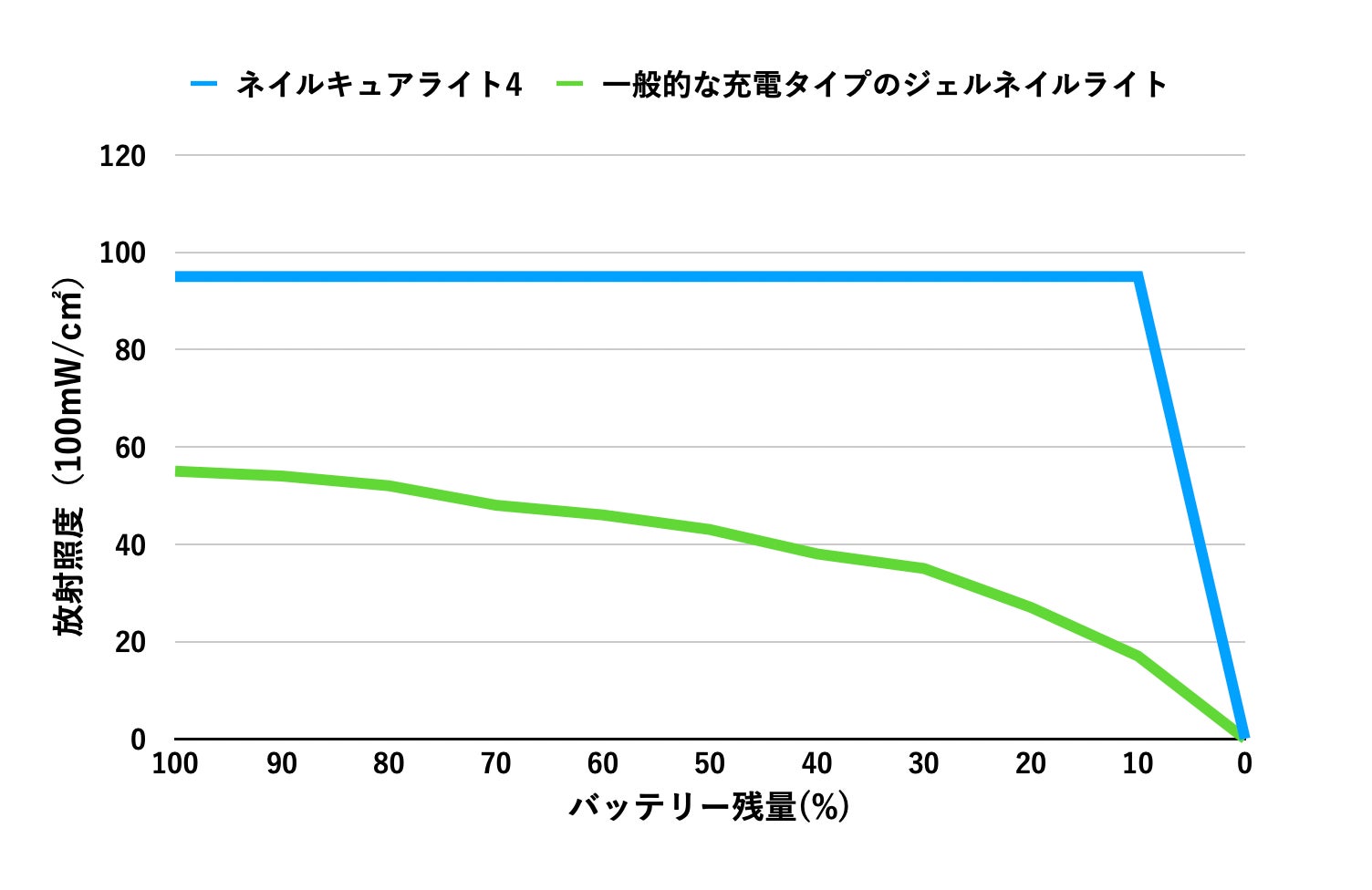 充電タイプのジェルネイルライトは、通常電池残量が少なくなるとパワー(放射照度)が落ちて、硬化スピードが落ちるなど影響がありました。ネイルキュアライト4は、パワーが充電残量に関わらず一定出力。安定した硬化スピードを実現します。