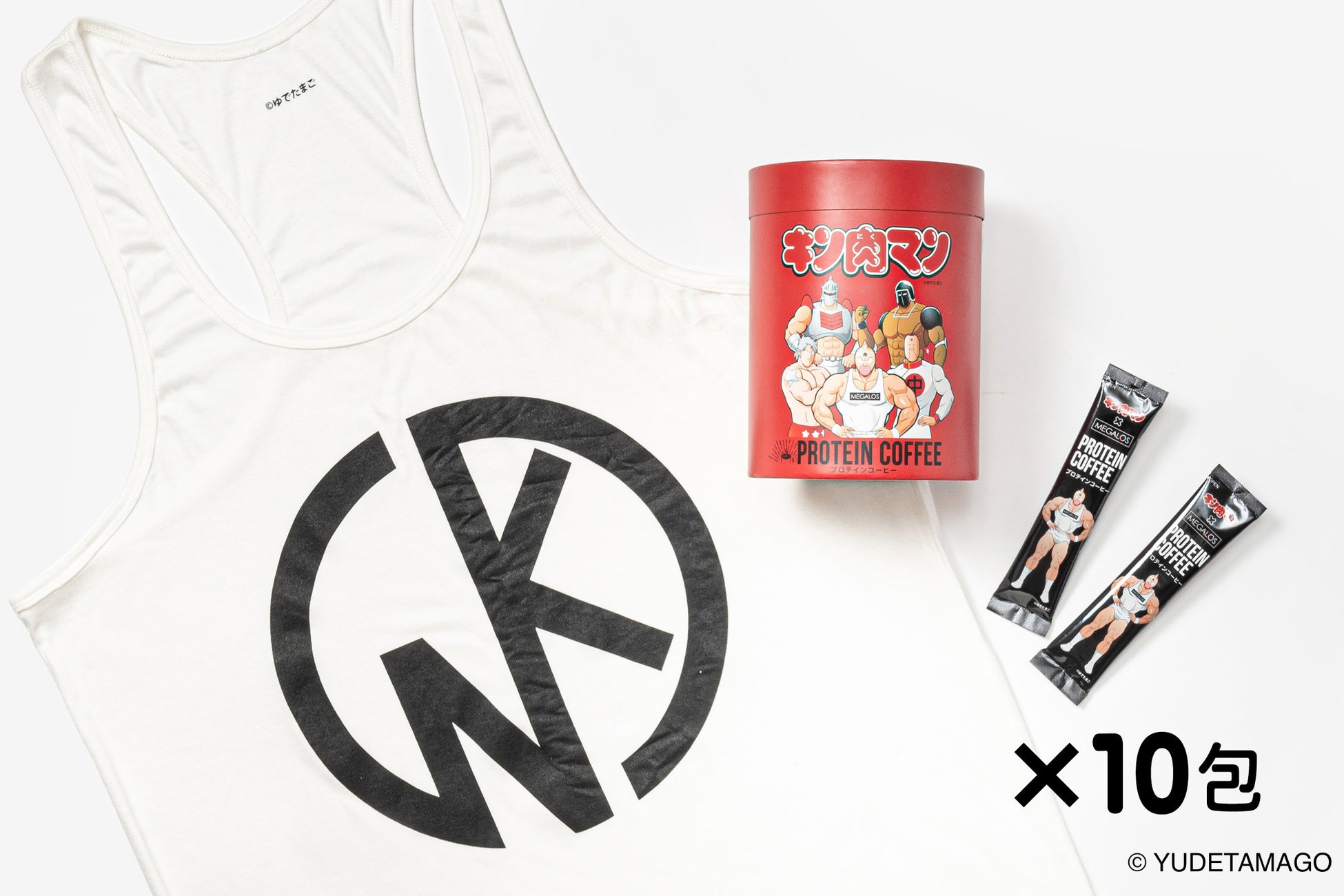 今回、キン肉マン特別パッケージ「正義超人Ver.」の PROTEIN COFFEE 30包入りタイプのほか、キン肉マンの「KINマーク」デザインのタンクトップ入りの限定版10包入りタイプも数量限定にて展開します。
