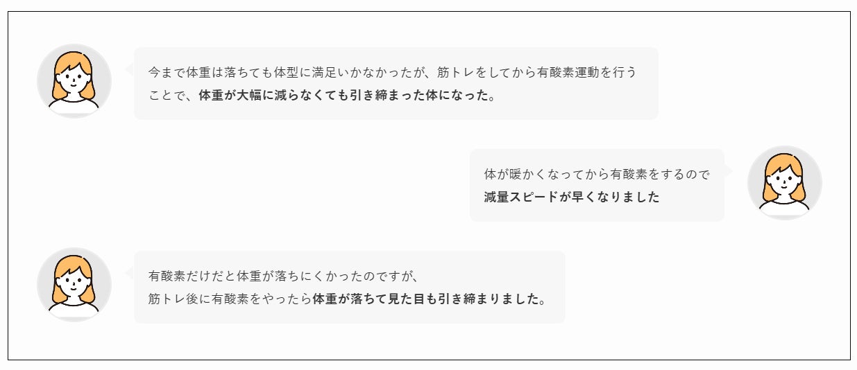 今まで体重は落ちても体型に満足いかなかったが、筋トレをしてから有酸素運動を行うことで、体重が大幅に減らなくても引き締まった体になった。
