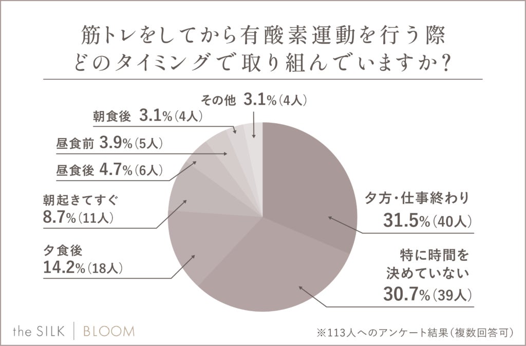 筋トレ+有酸素運動を行うタイミングについて、ダイエット経験がある女性113名に調査しました。