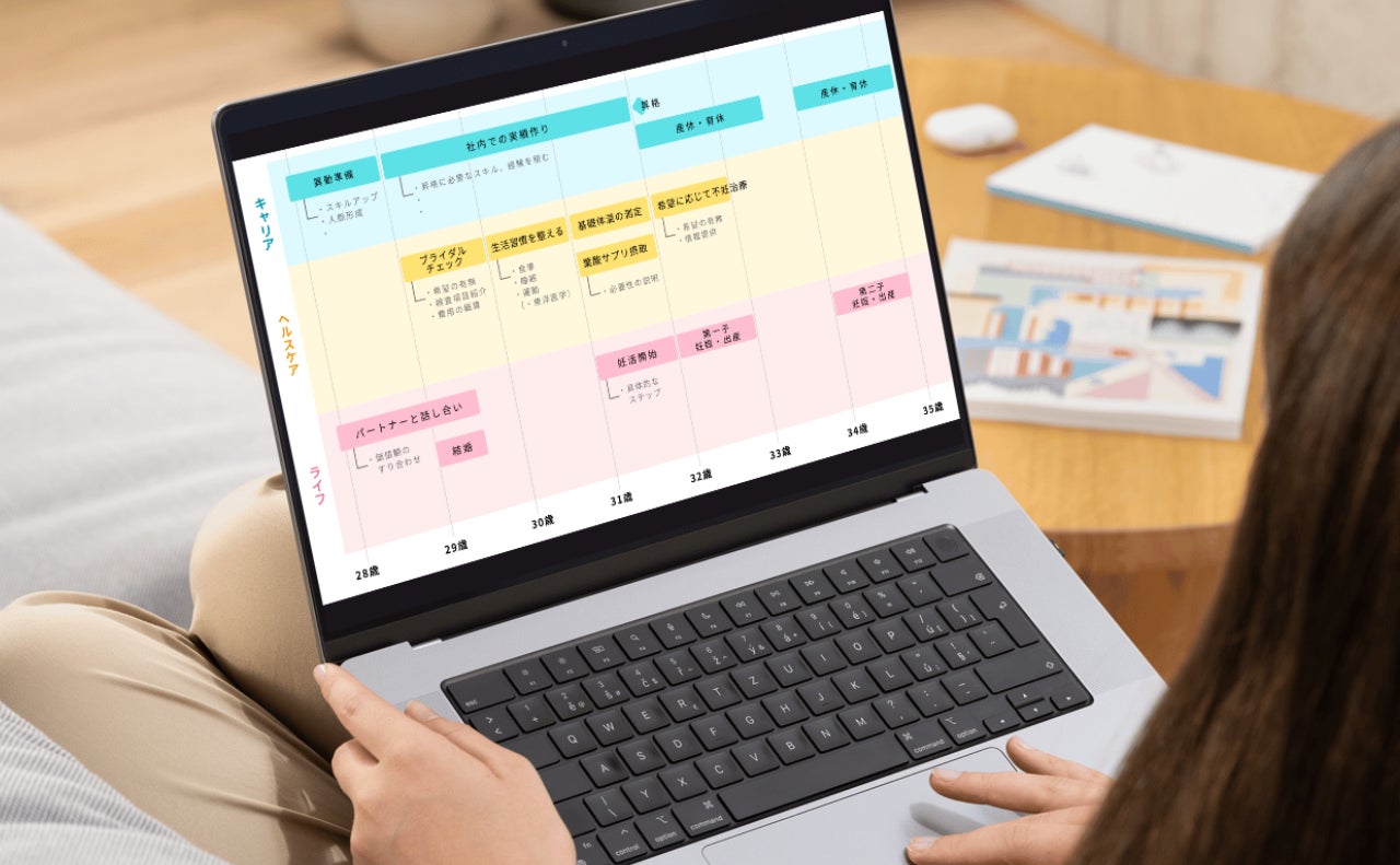 専門家と相談しながら、理想のライフやキャリアを実現させるためのマップ(計画表)を作成します。不妊治療をしている方だけでなく、まだ妊活を開始していない方にも対応しており、キャリアプラン、ライフプラン、ヘルスケアに関する「今やること」「これからやること」を明確にして、実行までをサポートします。