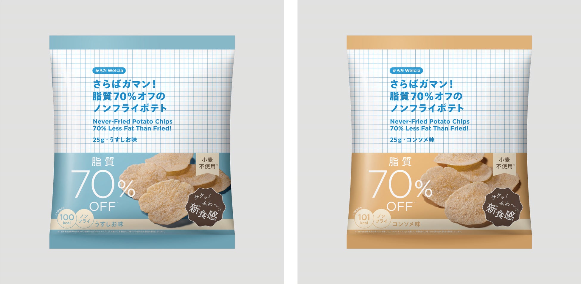 一般的なポテトチップスと比べ脂質は70%オフ※。じゃがいもの風味をしっかり感じるおいしさと、じっくり焼き上げたふわふわサクサク食感をぜひお楽しみください。