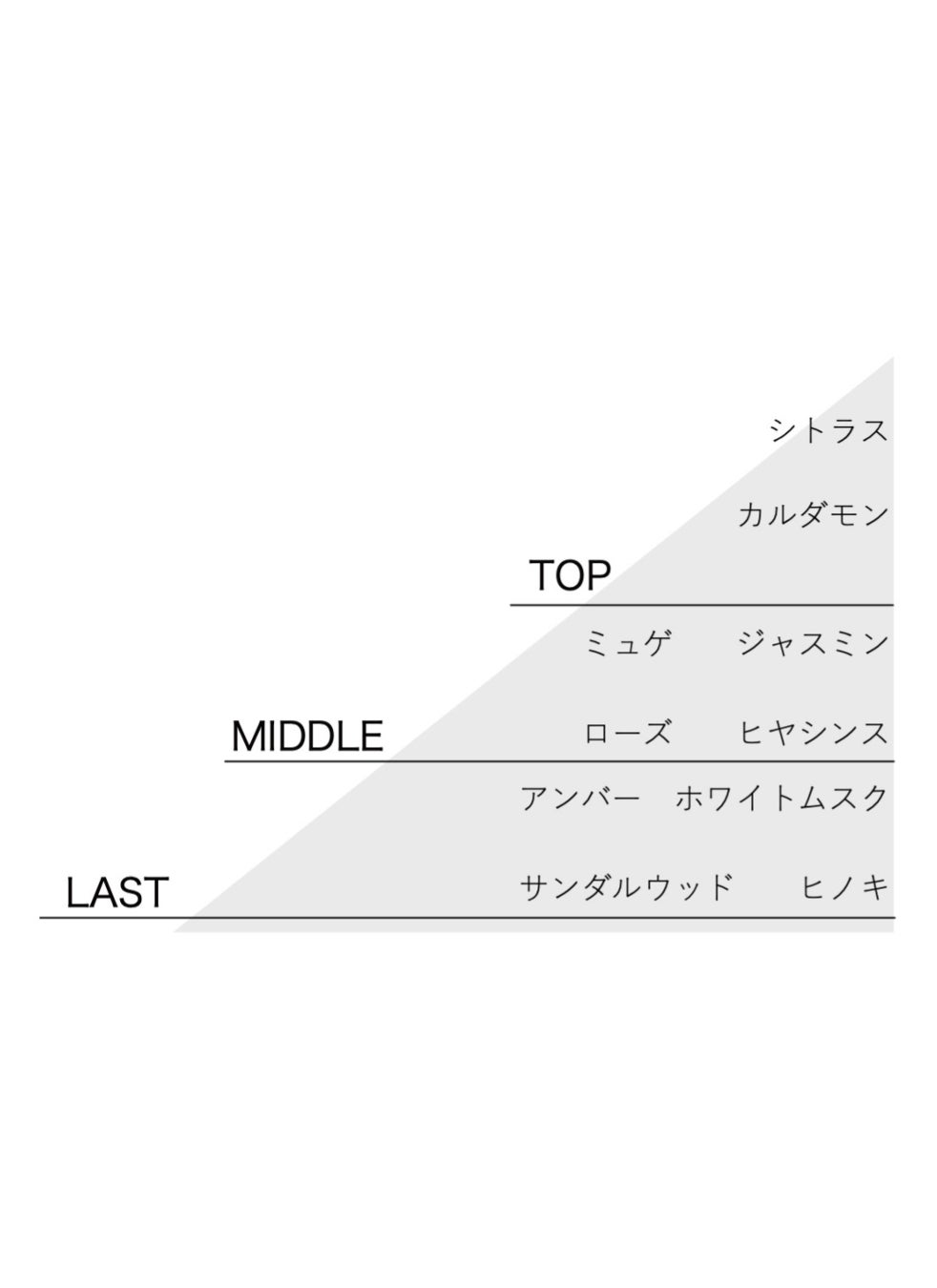 なめらかなアンバーと深みあるサンダルウッドに華やかなミュゲとジャスミン、ローズ、ヒヤシンスを合わせた、心地よい清潔感と重厚感が特徴的な上品な香り。