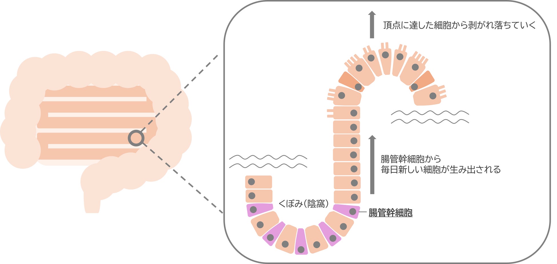 腸のくぼみ(陰窩)に存在し、腸の細胞を生み出す役割を担っています。