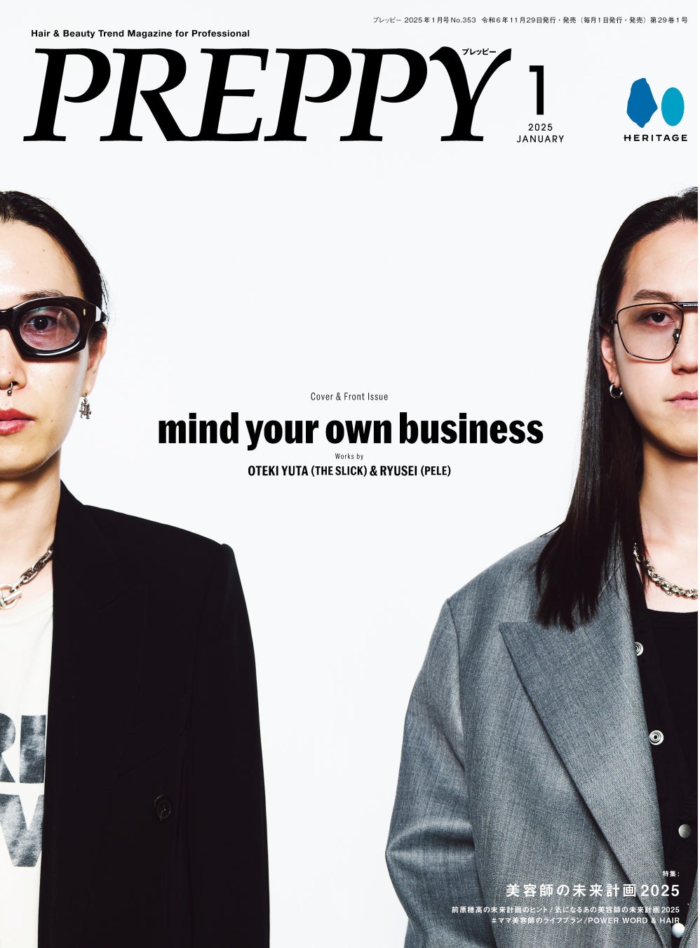 PREPPY1月号の表紙・巻頭SPECIAL「mind your own business」は、『ザ・スリック』の樗木佑太さんと『ペレ』RYUSEIさんが登場。最高峰のカラーを追求し、進化し続ける二人が最新のクリエイションを公開! 互いをリスペクトする理由やクリエイションのこと、2025年の未来予測についてまでインタビューしました。