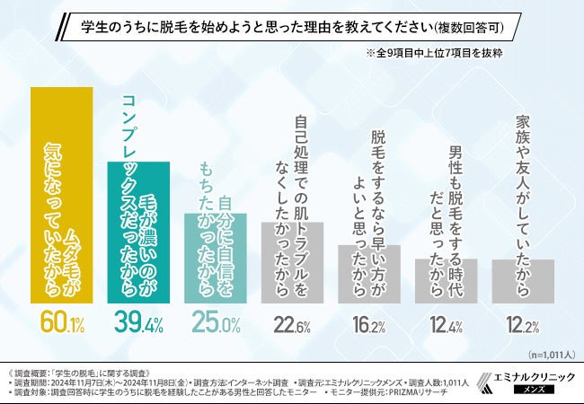 はじめに、「学生のうちに脱毛を始めようと思った理由を教えてください(複数回答可)」と質問したところ、『ムダ毛が気になっていたから(60.1%)』と回答した方が最も多く、次いで『毛が濃いのがコンプレックスだったから(39.4%)』『自分に自信をもちたかったから(25.0%)』となりました。