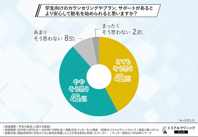 「学生向けのカウンセリングやプラン、サポートがあるとより安心して脱毛を始められると思いますか?」と質問したところ、約9割の方が『とてもそう思う(42.3%)』『ややそう思う(46.4%)』と回答しました。