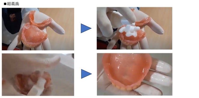 1.上下いずれかの総入れ歯で2プッシュ目安に、適量の泡を入れ歯に吐出する ※マウスピース、リテーナー、マウスガードも同様の洗浄方法 |