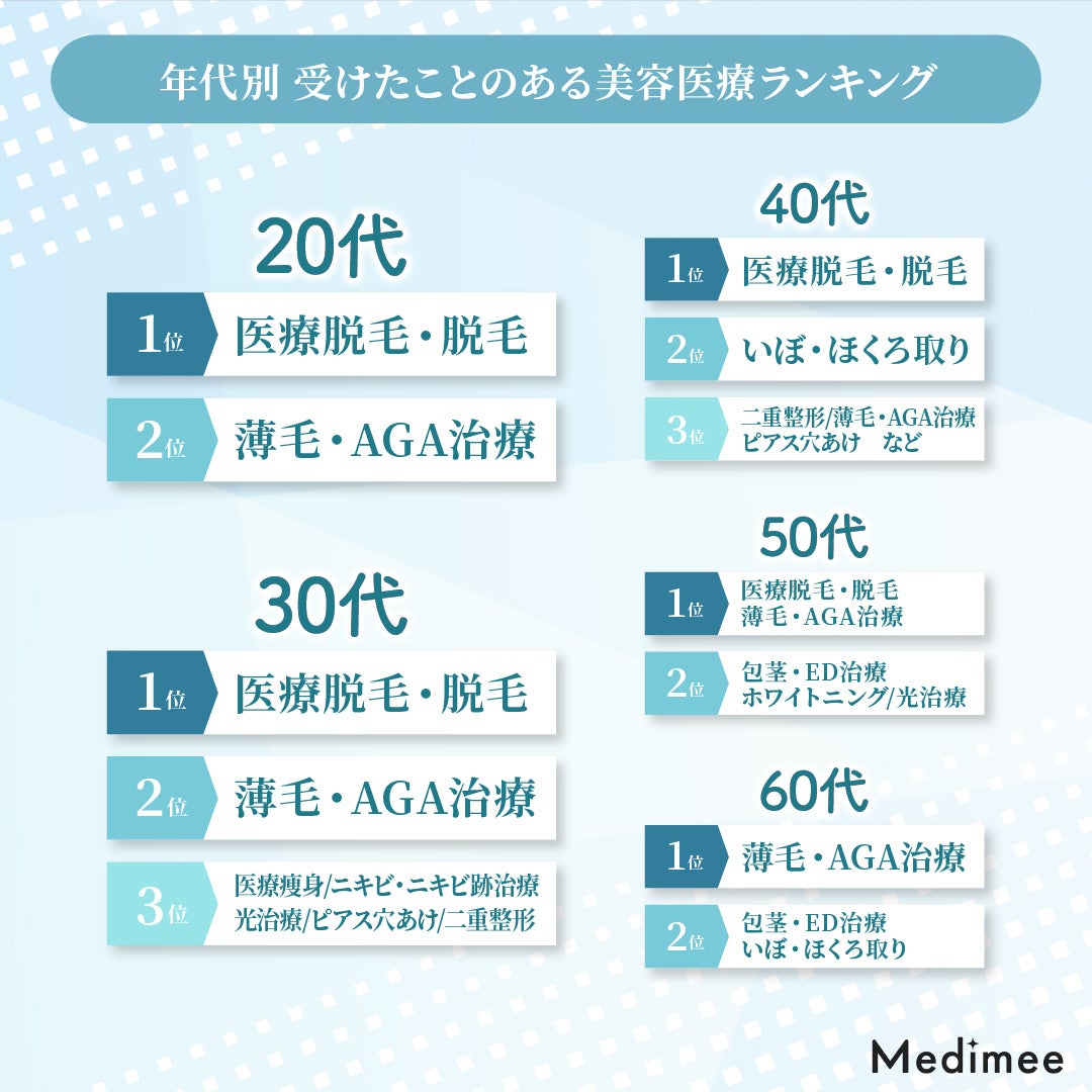 年代別に今一番興味のある美容医療を聞いてみたところ、20〜40代は「医療脱毛・脱毛」、50代は「ニキビ・ニキビ跡治療」、60代は「薄毛・AGA治療」が1位という結果になりました。