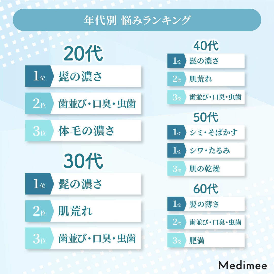 20〜40代は「髭の濃さ」、50代は「シミ・そばかす・シワ・たるみ」、60代は「薄毛」に悩んでいると回答。最近は男性にも人気が高まっているメンズ美容医療の実態についてアンケート調査を行いました。