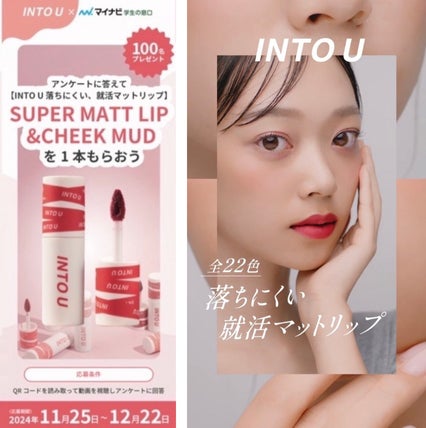 中国発、人気コスメブランド「INTO U(イントゥユー)」を企画・販売している麗知株式会社(本社:東京都千代田区 代表:楊 茜)は、総合人材サービス会社のマイナビが運営する大学生向けメディア『マイナビ学生の窓口』(https://gakumado.mynavi.jp/)とのキャンペーンで、2024年11月25日から12月22日まで、独特の質感と塗り心地でブランドNO.1人気のスーパーマットリップ&チークマッドを就活生にプレゼントする『大学キャンパス100名抽選キャンペーン』を実施します。