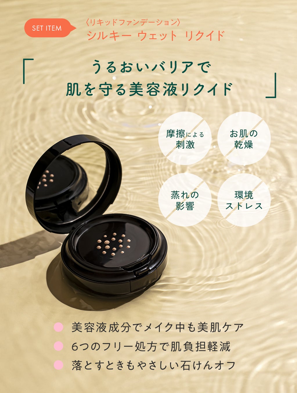 ※モイスチュア クレンジングオイル:150ml 通常価格2,420円(税込)、シルキー ウェット リクイド(本品):12g 通常価格4,400円(税込)、ハート型カバー付きミラー:非売品、シルキー ウェット リクイド サンプル:非売品