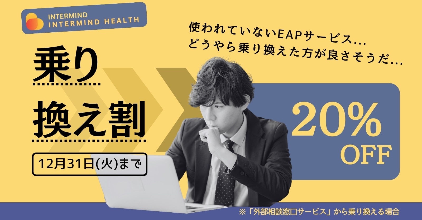 従業員のメンタルヘルスケアを支援する株式会社INTERMIND(インターマインド、本社:東京都中央区、代表取締役:藤原 逸聖)は、利用されない外部相談窓口から効果的なメンタルヘルス支援モデルに切り替えられるよう「乗り換え割キャンペーン」を実施することをお知らせします。