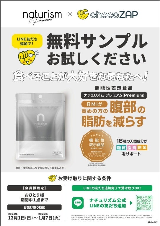 方 法 : chocoZAP店舗にてコラボ期間中、ナチュリズムの「LINEのお友だち追加完了」でおひとり様1袋ナチュリズム プレミアム(63粒入り)をプレゼント。