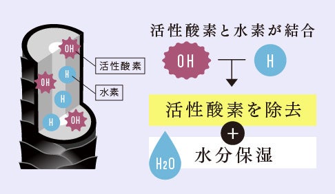 水素(H)は、ダメージの原因となる活性酸素(OH)と結びついて無害な水(H2O)へと変換されるため、髪や頭皮に残る酸化ダメージを抑制します。