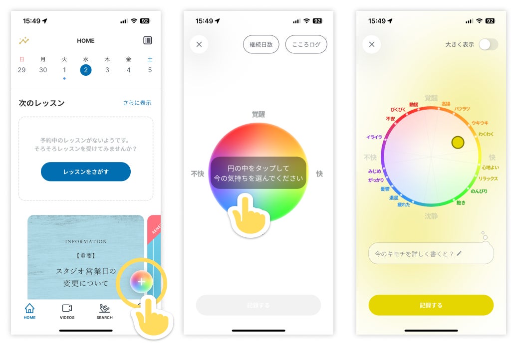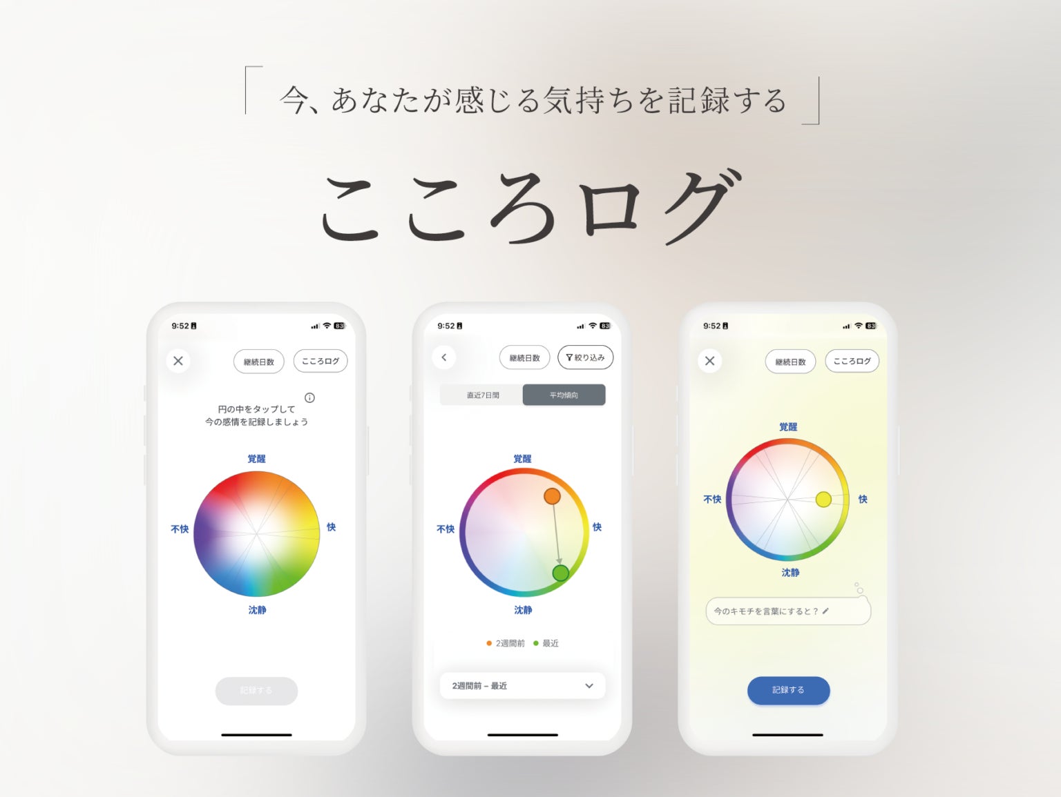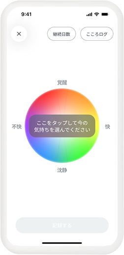 「こころログ」は、1日1回とレッスン前後に1回ずつ、円形に配置した円環図の中から自分の今の感情(覚醒、不快、快、不快)を1タップで簡単に記憶することができます。