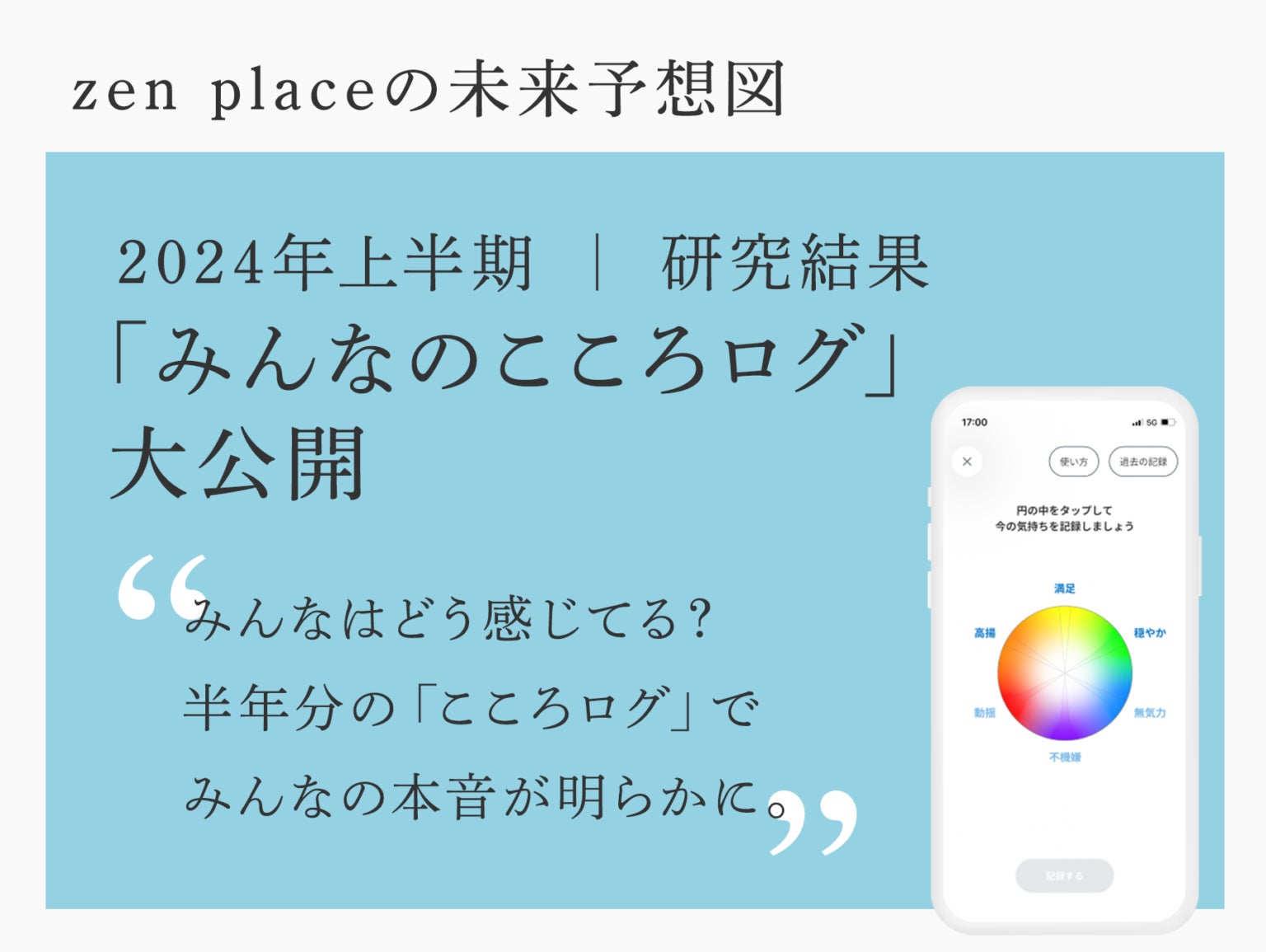最先端研究結果・科学をもとに、グローバルな環境で最新技術とDXで挑戦を重ね、サービス業界にイノベーションを起こしている最先端のWeb3.0 DX企業であり、ウェルビーイング創造のリーディングカンパニーである株式会社ZEN PLACE(本社:東京都渋谷区 代表取締役:尾崎成彦)は、「心(こころ)の状態」を可視化するツールとして、zen place公式アプリで「こころログ」の提供をしています。