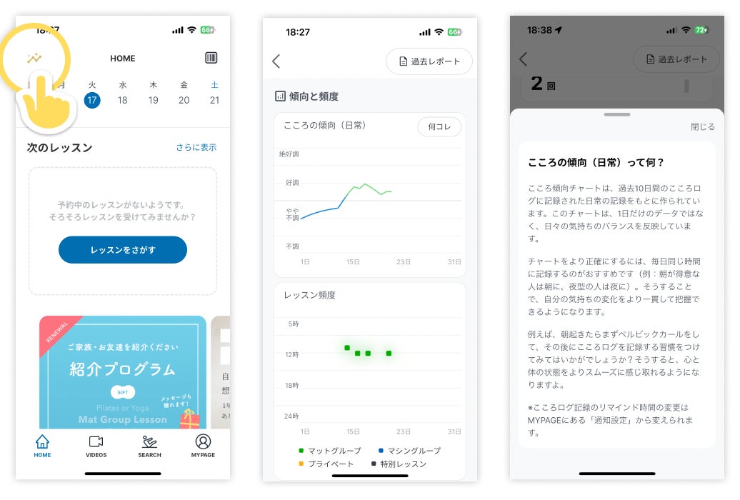 こころログを記録するタイミングは「通常時」「レッスン前」「レッスン後」の3種類あります。 zen placeでは会員様の心の変化のデータを集積し、レッスン開発やシステム開発に役立てています。