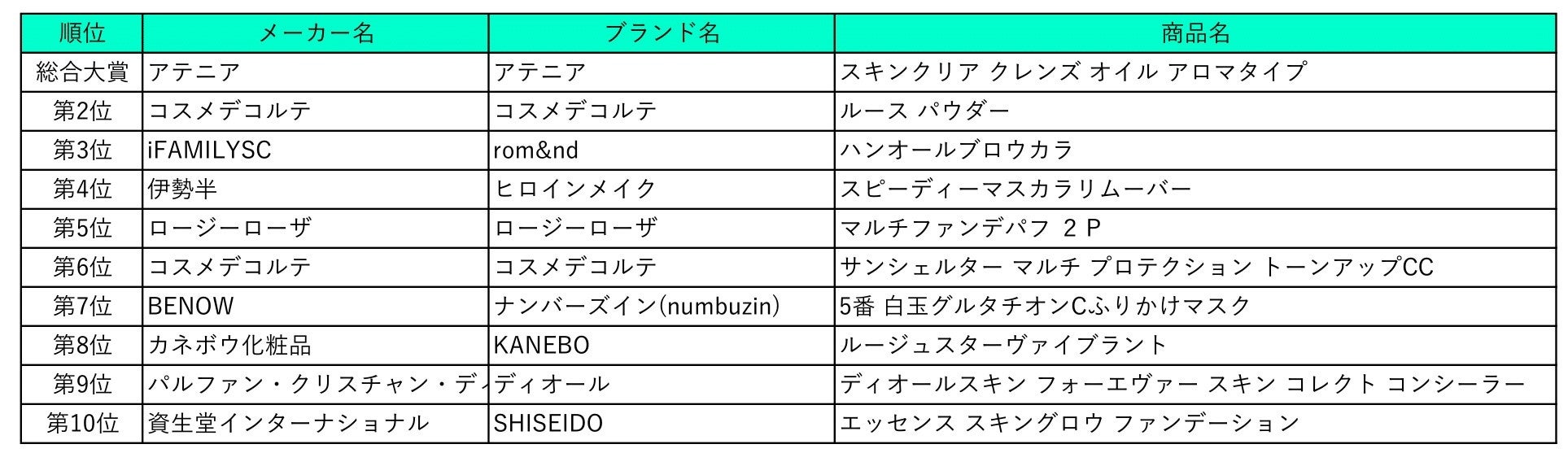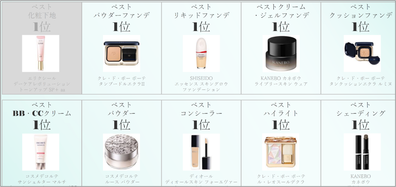 加えて、アイテム別賞の同カテゴリを見てみると、1位に輝いていたのは全10部門中9部門が高価格帯アイテムであり、消費者がベースメイクへの投資意向が高いことがうかがえます。