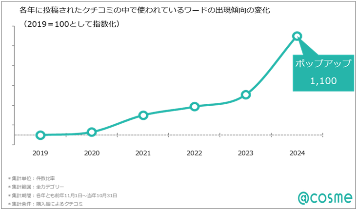 このような流れの一例として、この1年間で@cosme TOKYO、@cosme OSAKAをはじめ多くの店舗やイベントスペースで開催されている期間限定のポップアップイベントをきっかけとする「店頭回帰」があります。ベストコスメアワード集計対象期間中のクチコミでも、「ポップアップ」というワードの出現率は昨年と比較すると2倍に増加しており、実際のクチコミでも「@cosme OSAKAでポップアップに遭遇し、衝動買いしてしまいました!」といった声のほか、「@cosmeでポップアップが開催されている時に購入しました。店員さんのおすすめ聞いたり、人気の品番聞いたりしました」といった声が見受けられます。新商品に出会えるワクワク感に加えて、その場で商品を手に取って、お試しができたり、ブランドの方から直接説明を聞きながら自分にあったものを失敗なく選べることも購入の後押しとなっていることが考えられます。