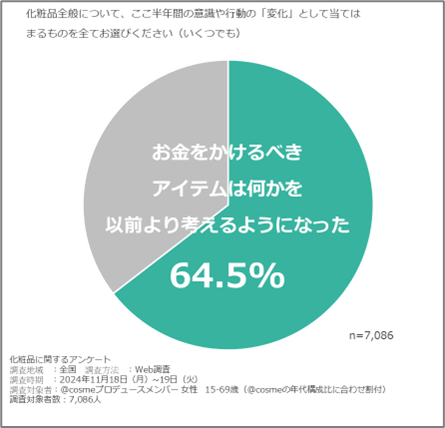 新作コスメや韓国コスメの取り入れが進む一方で、引き続き、消費者の購買には物価高の影響がみられます。ユーザーアンケートで、半年前と比べたときの気持ちや行動の変化として当てはまるものを聴取したところ、「お金をかけるべきアイテムは何かを以前より考えるようになった』と回答した人が全体の64.5%にのぼり、物価高騰が長期化していく中、消費者のなかでは投資する先の取捨選択がより慎重になってきていることがわかります。