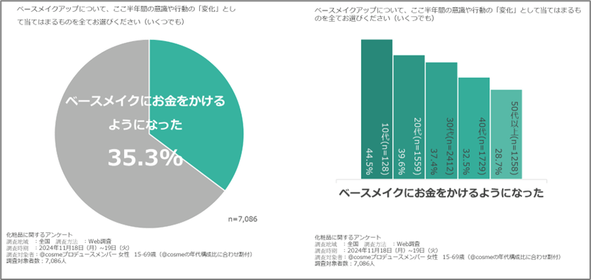 ユーザーアンケートでも、「ベースメイクにお金をかけるようになった』と回答している人が全体の35.3%をマークしていることからも、物価高の影響を受け、投資をするポイントをシビアに見極めるようになった生活者が投資したいアイテムとして選んでいるのが「ベースメイク」であることがわかります。では、なぜ生活者が「ベースメイク」への投資を選んだのか?生活者の声をより深堀してみるとその理由が見えてきました。