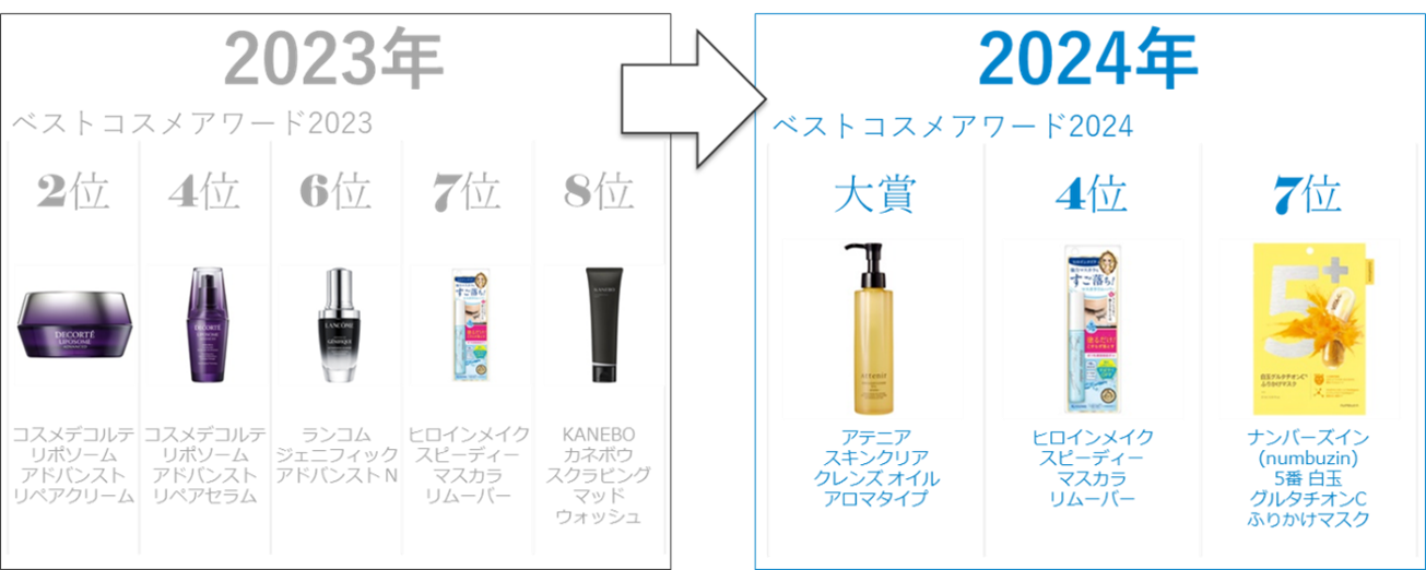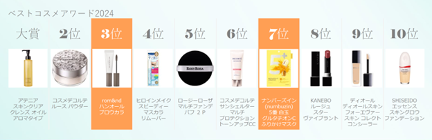 「@cosmeベストコスメアワード2024」は、生活者のクチコミに加え、どのくらい注目された商品かなどを加味して、順位を決定しています。