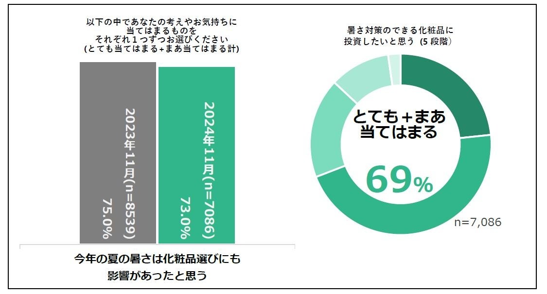 ユーザーアンケートで「気持ちや行動の変化として当てはまるもの」を聴取したところ、『今年の夏の暑さは化粧品選びにも影響があったと思う』に「当てはまる」と回答した人が全体の73%、『暑さ対策のできる化粧品に投資したいと思う』に「当てはまる」と回答した人が全体の69.1%に及んでいます。