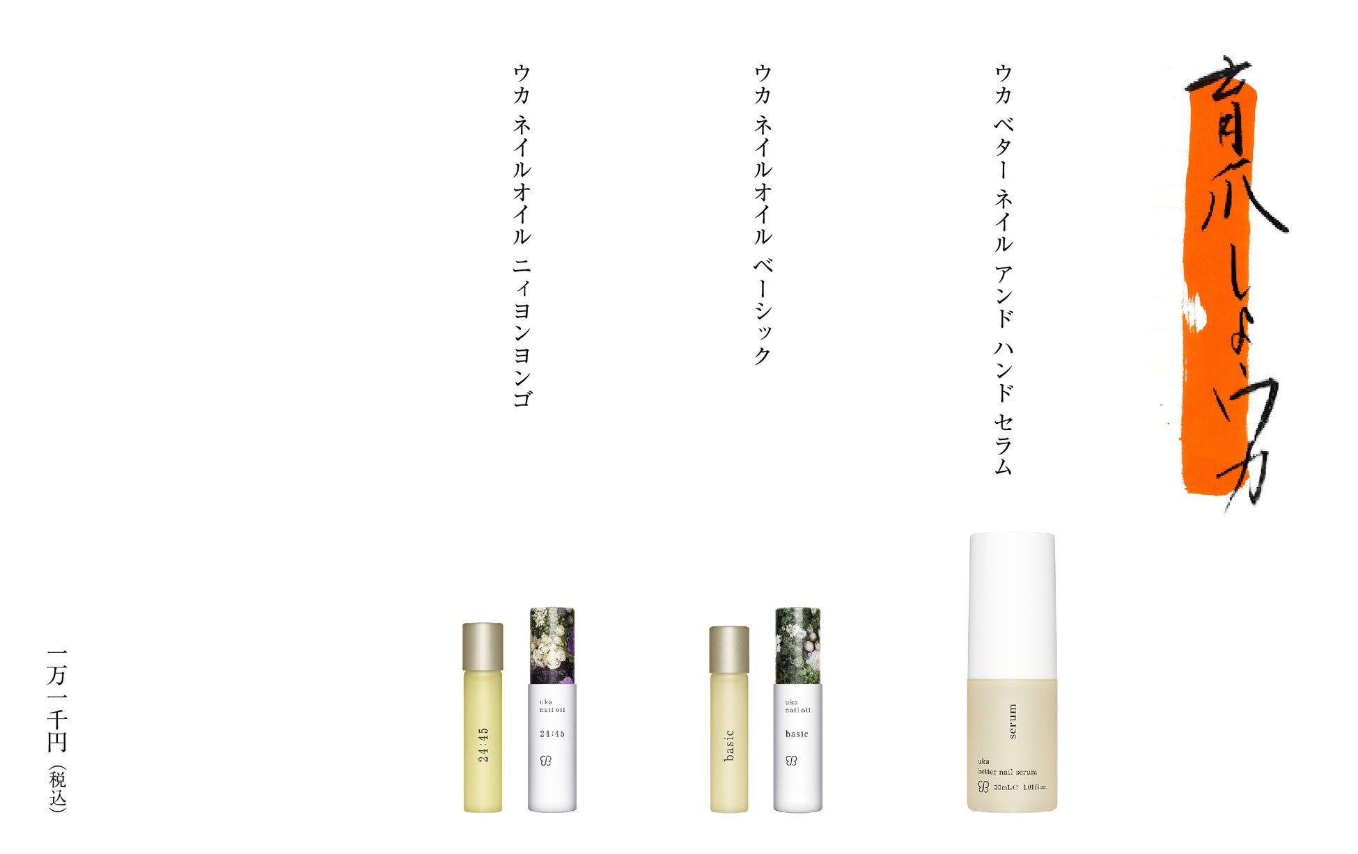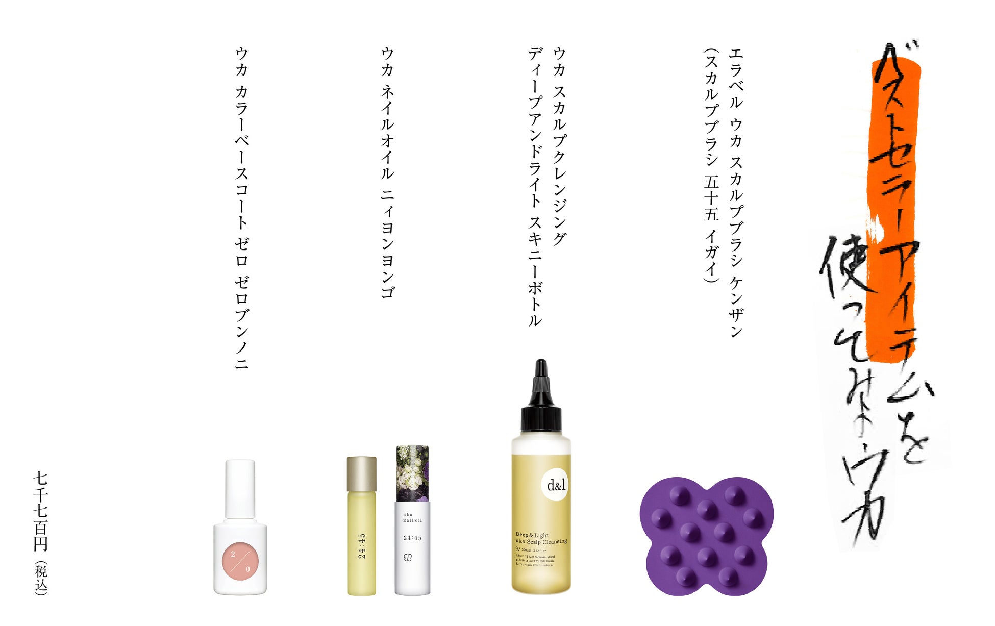 ウカのベストセラーアイテムを揃えたセット。人気のケンザンとスカルプクレンジングの頭皮ケアと、ネイルオイル&カラーベースコートでハンドケアを。