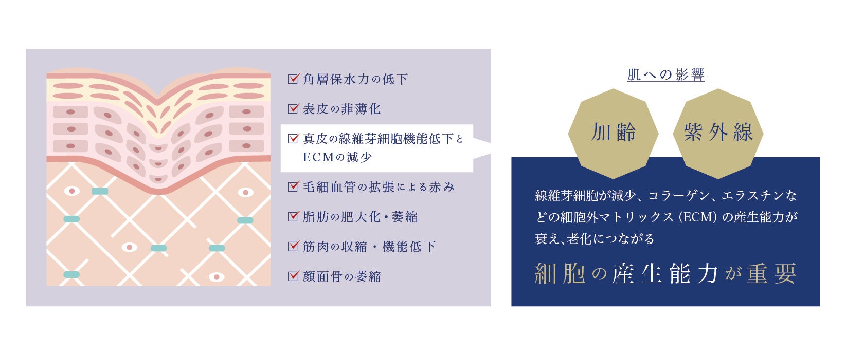 シミ、しわ、たるみ、乾燥、しぼみ、くすみ…。年齢を重ねると、肌にはさまざまなトラブルが現れます。これは、肌の機能そのものが衰えることに起因します。肌の表面にある角層から内側にある表皮層、真皮層はもちろん、筋肉や骨が変化してしまうからです。特に大きな影響があると考えられているのが、真皮層にある幹細胞(線維芽細胞)の機能低下と、ECM(細胞外マトリックス。皮膚の形状を保つ成分)の減少です。幹細胞(線維芽細胞)はコラーゲンやエラスチンなど肌のハリ・弾力を保つ成分や、水分保持の役割を果たすヒアルロン酸などを作り出す細胞のこと。この細胞の機能が低下したり減少したりすると、コラーゲンやエラスチン、ECMが作られなくなり、肌の老化につながります。つまり、若々しい肌でいるためには、細胞の産生能力に着目する必要があるのです。
