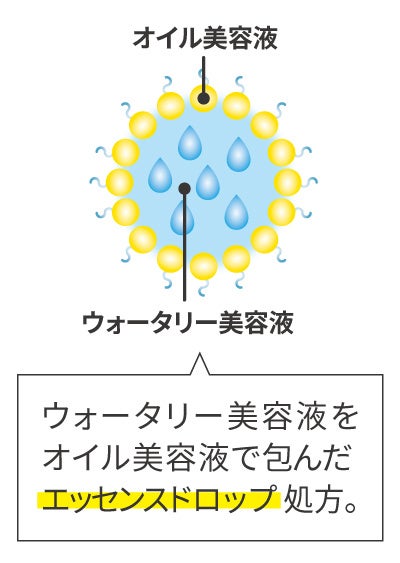 美容液成分(保湿成分ダマスクバラ花水、整肌成分アデノシン)をオイルで包み込んだ【エッセンスドロップ】処方で3つの嬉しいつけ心地。