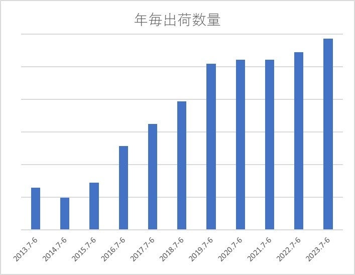 1932年創業の当社は、1937年に初めて発売したふきとり化粧水「ナリス コンク」以来角層研究を続けており、現在ではふきとり化粧水の国内企業別販売シェアは、9年連続No.1です。(TPCマーケティングリサーチ株式会社 2024年4月調べ)当社は流通に合わせて異なる顧客層のニーズに合わせて、自社ブランドのみで約10種類のふきとり化粧水を販売しており、「ネイチャーコンク」は、当社で唯一ドラッグストア流通で展開している医薬部外品のふきとり化粧水です。手軽に角層ケアを体験できるよう、ふきとり効果に加えて保湿機能を持たせるなど多機能のふきとり化粧水としてのブランディングを行い2013年にデビューした後、3年目以降は毎年売り上げを伸ばし、2024年11月末の段階では、累計の売上本数は850万本※1を超えています。(下のグラフは、その年度の7月~6月までの1年間ごとでまとめています。)