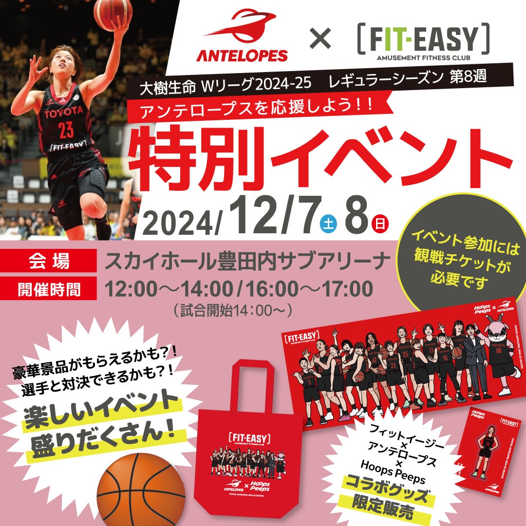 全国にアミューズメントフィットネスクラブを展開するフィットイージー株式会社 (本社:岐阜市)は、2024年12月7日(土)、8日(日)に愛知県豊田市のスカイホール豊田で開催されるトヨタ自動車女子バスケットボール部「アンテロープス」のホームゲームで、ブース出展をいたします。