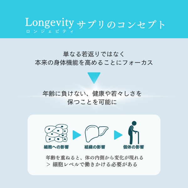 Longevityは、年齢に抗うのではなく、自然体を受け入れるあなたをサポートする全く新しいサプリメント。身体本来の力を引き出し、健康的に美しく生きるあなたをいつまでもサポートします。