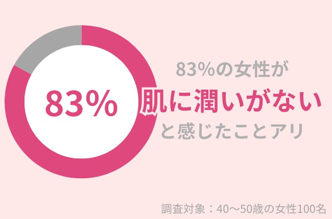 調査の結果、40代女性のうち、83%の方が「肌に潤いがない」と感じたことがあるようです。肌に潤いがないと、シワっぽく見えてしまいます。若々しく健康な印象のお肌を作るには、肌に潤いを与える保湿を行うことが重要です。