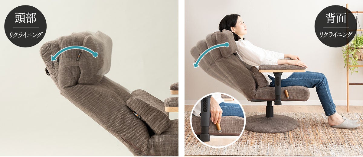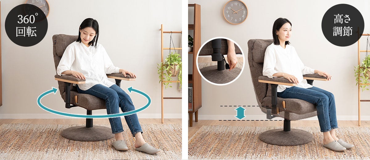 上質な座り心地と機能性を兼ね備えた高座椅子『akari-あかり-プレミアム』は、体にフィットするように細かく調節可能な機能と優れたデザインで、リビングやワークスペース、趣味の時間まで、さまざまなシーンを快適に演出します。360度回転や昇降機能をはじめ、細部まで身体に寄り添った設計で、毎日の生活をもっと豊かにします。