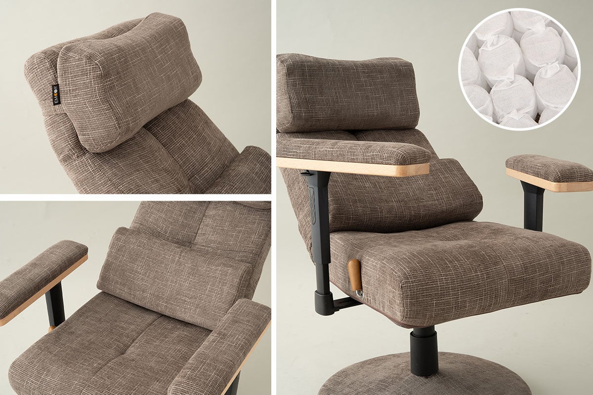 疲れにくく快適な座り姿勢の秘訣は背もたれにあります。『akari-あかり-プレミアム』は、人それぞれ異なる背中の形やお好みに合わせて、理想的な背もたれにカスタマイズが可能。寝具・家具、双方に専門性をもったエムールだから実現できる、高品質な可動式クッションが付属します。座面には耐久性に優れたポケットコイルシートを採用。一般的なウレタンを使用した座面より、寿命が長くヘタりにくいのが特徴です。
